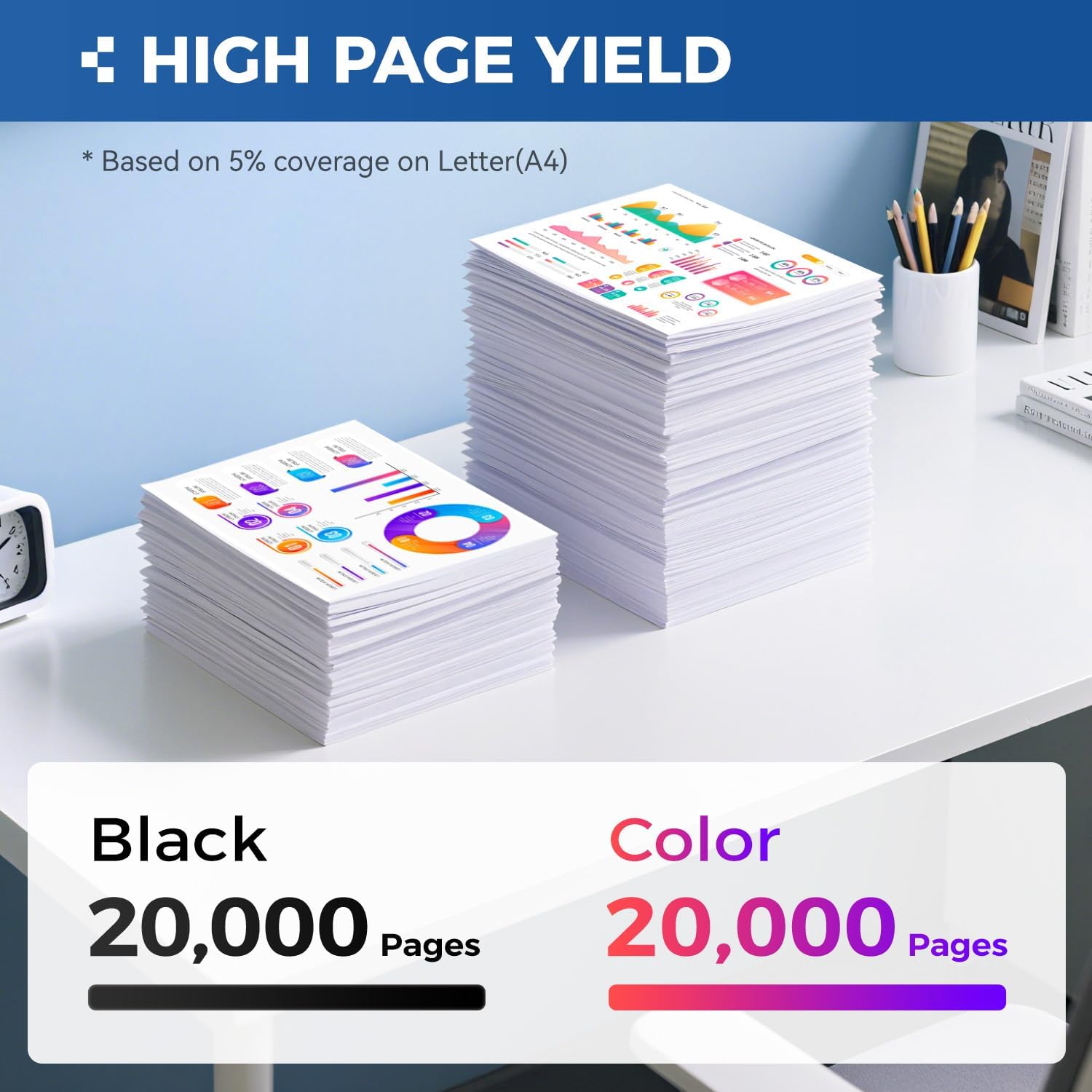 - Page Yield: Up to Black is 20,000 pages per black cartridge and Color is 20,000 Pages per color cartridge (Letter/A4, at 5% Coverage).