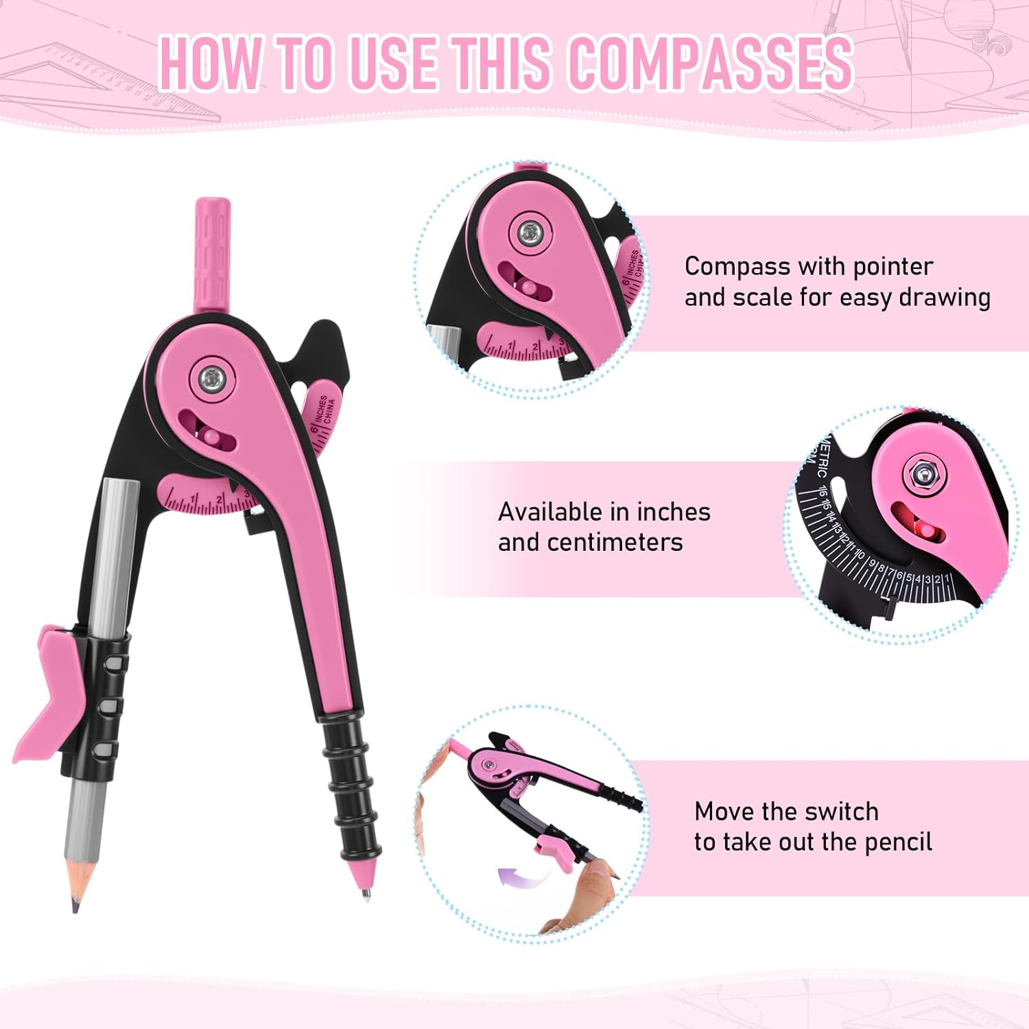 EBOOT Student Geometry Math Set, Drawing Compass and 6 Inch Clear Swing Arm Protractors 180 Degree Math Protractor(Pink)
