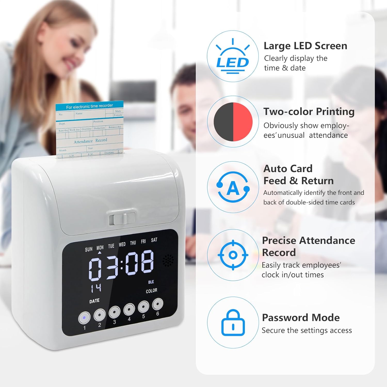 - ๐๐๐๐ผ ๐๐น๐ถ๐ด๐ป & ๐๐ฎ๐ฟ๐ฑ ๐๐ฒ๐ฒ๐ฑ๐ถ๐ป๐ด - The time clock punch machine automatically feeds the time card and identifies its front and back. If the card is not correctly inserted, it will be returned. ๐ก๐ผ๐๐ฒ: ๐๐ณ ๐๐ผ๐ ๐๐ฎ๐ป๐ ๐๐ผ ๐๐๐ฒ ๐๐ผ๐๐ฟ ๐ผ๐๐ป ๐๐ถ๐บ๐ฒ ๐ฐ๐ฎ๐ฟ๐ฑ๐, ๐ฝ๐น๐ฒ๐ฎ๐๐ฒ ๐๐๐ฟ๐ป ๐ผ๐ณ๐ณ ๐๐ต๐ฒ ๐ฎ๐๐๐ผ-๐ฎ๐น๐ถ๐ด๐ป ๐ณ๐๐ป๐ฐ๐๐ถ๐ผ๐ป.
