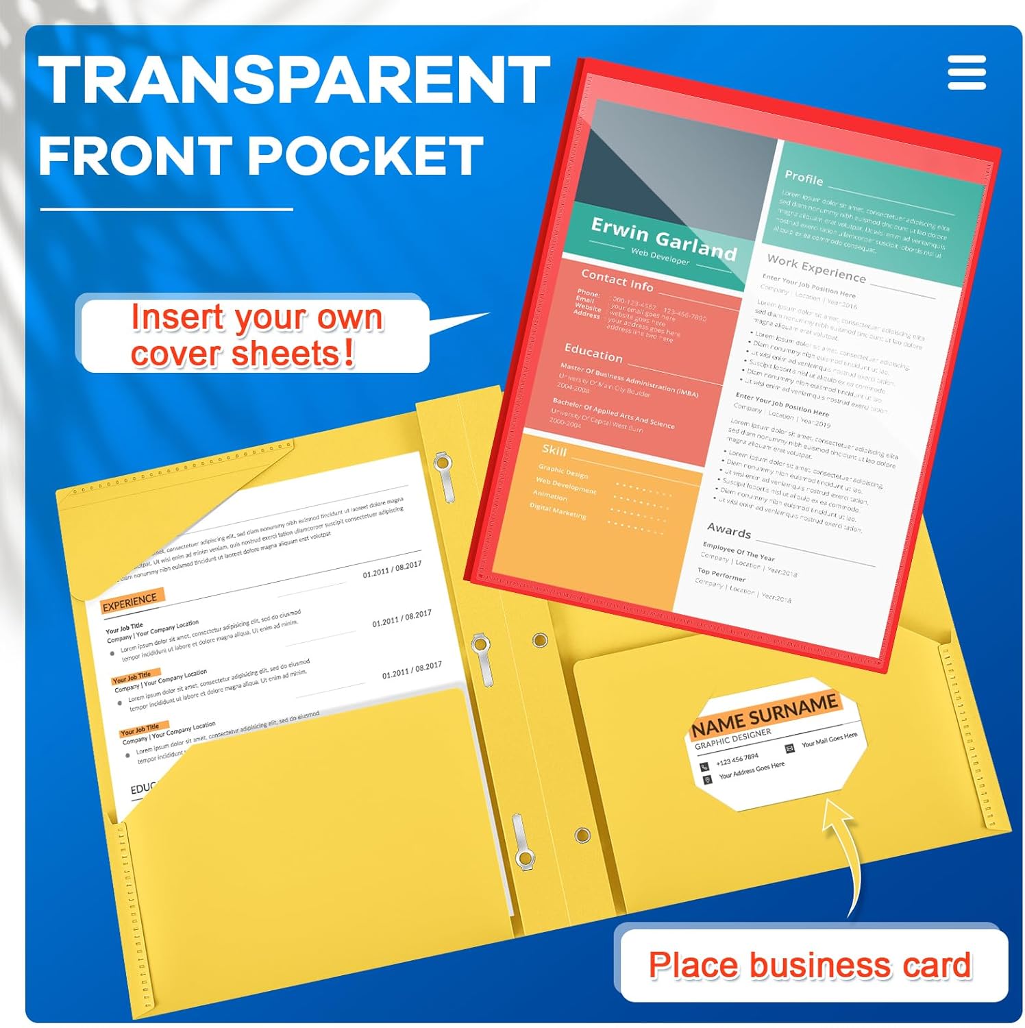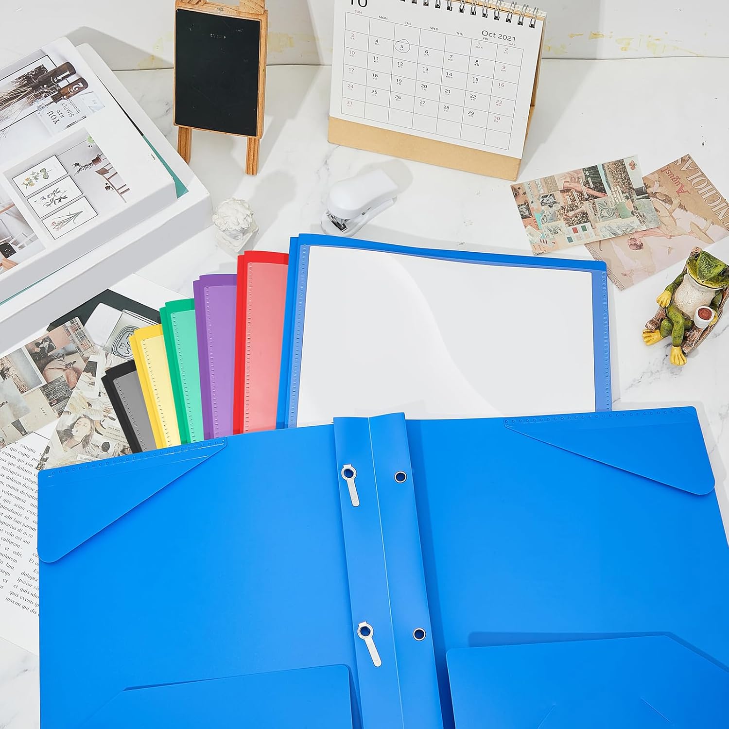 - Practical and Useful: with a clear front pocket, you can put your catalog, tables, favorite reports, presentations and more for clear display; Each plastic folder has 2 internal pockets to help organize and store your letter sized paper and documents, there are also 3 prongs to secure your 3-hole loose leaf paper, and the card slot can hold your ID card or business card, practical for your daily work