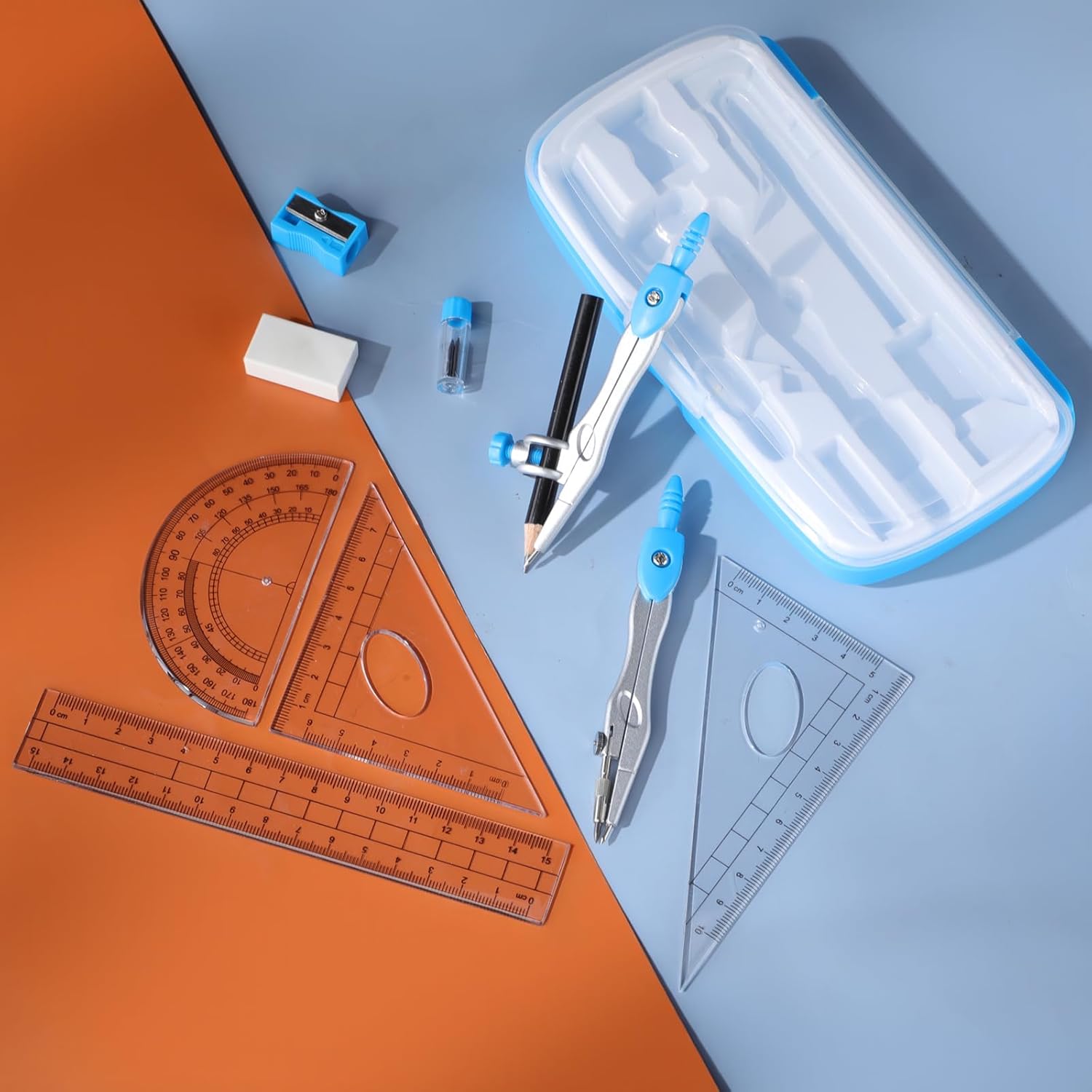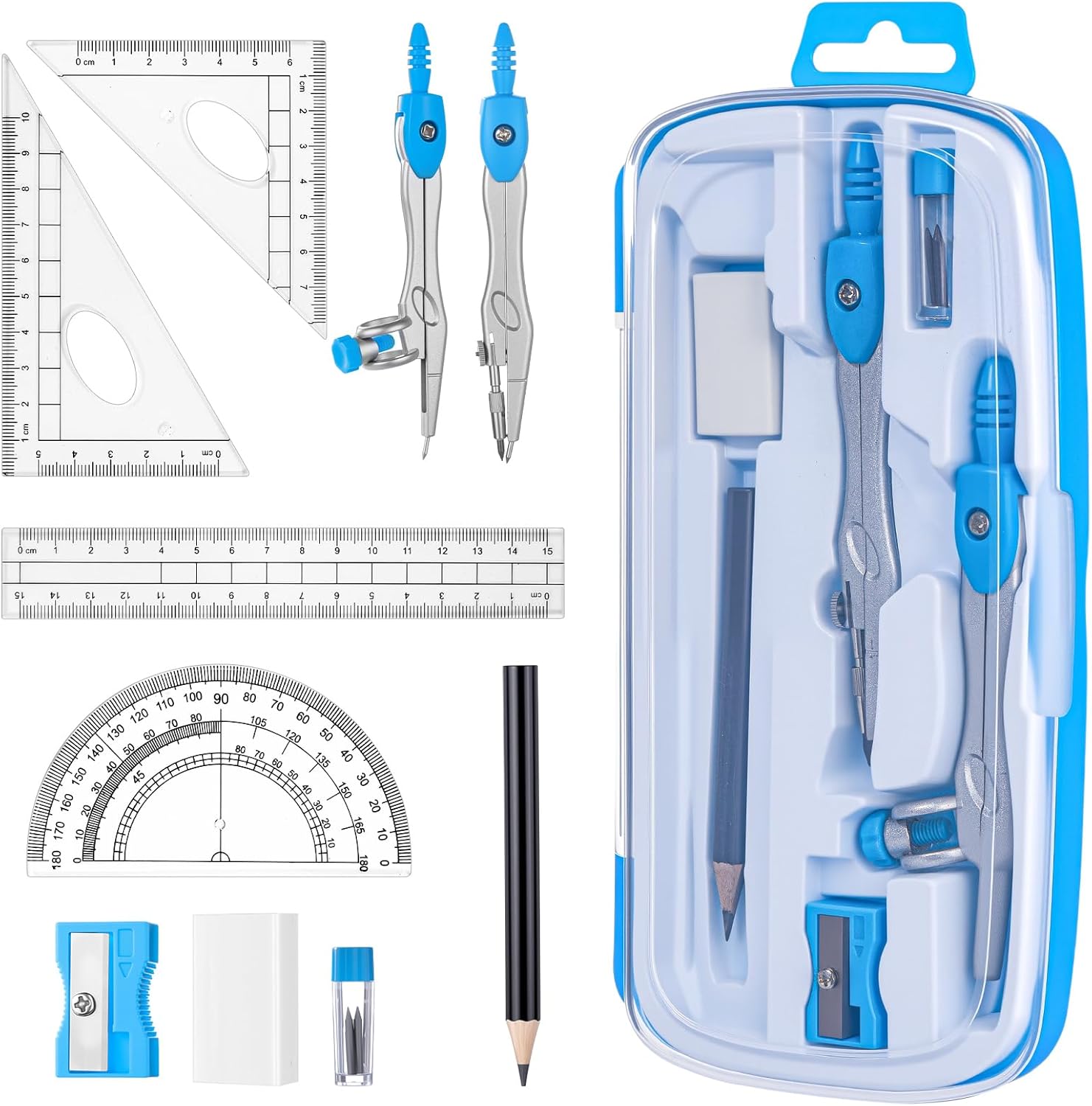 - Package Includes: the geometry set includes 2 compasses, 2 triangles, 1 ruler, 1 protractor and 1 pencil, 1 eraser, 1 sharpener, and 1 box of pencil lead refill, ensuring that you have all the tools you need for precise geometry calculations