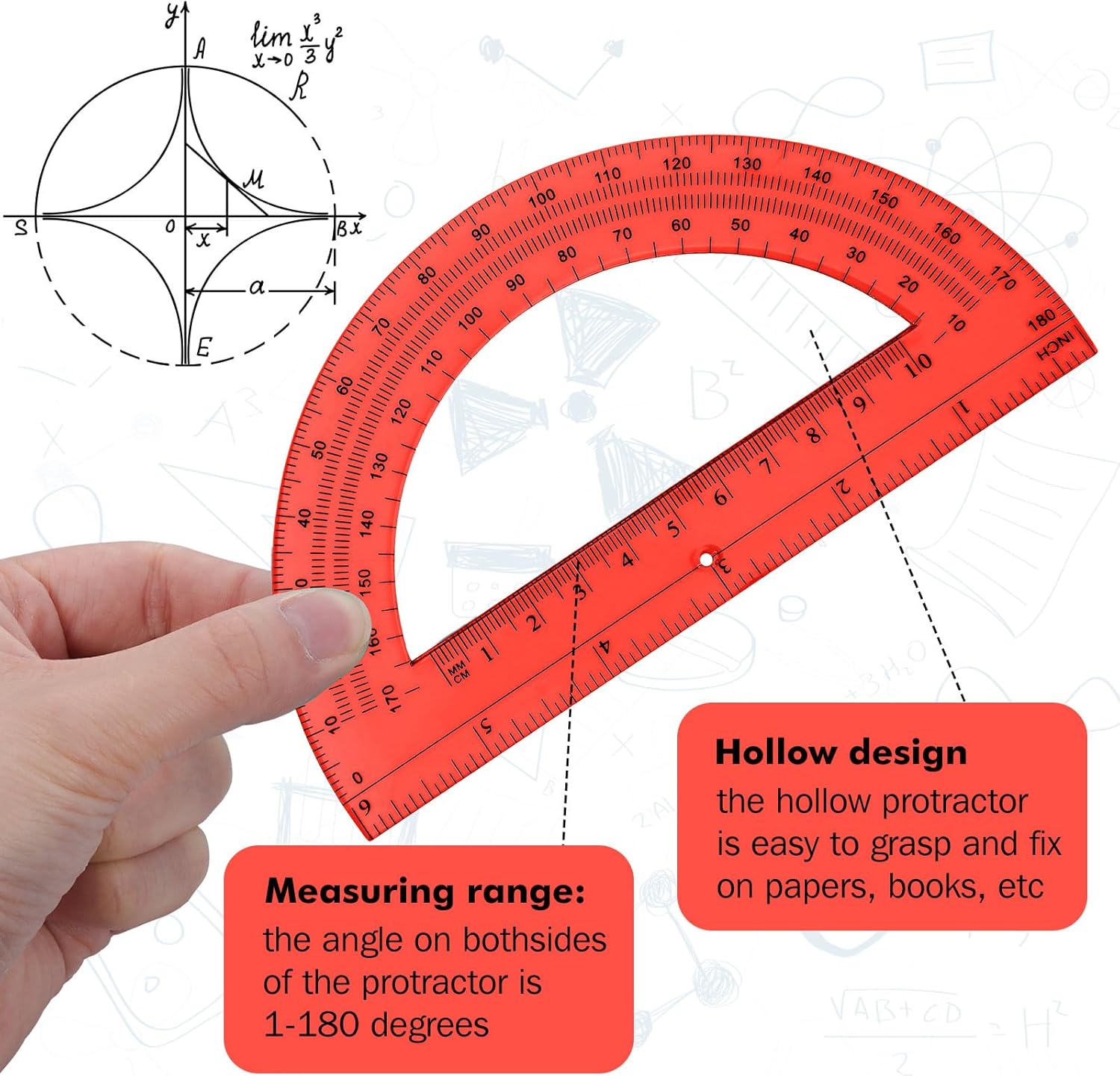 - Nice Quality: the translucent protractor is made of reliable transparent plastic and easy to carry and put in a pencil case or a backpack; These translucent plastic protractors make it easier to observe the measure data to help draw and measure angles and shapes accurately; The thickness of the protractors is controlled so that they are not easy to break