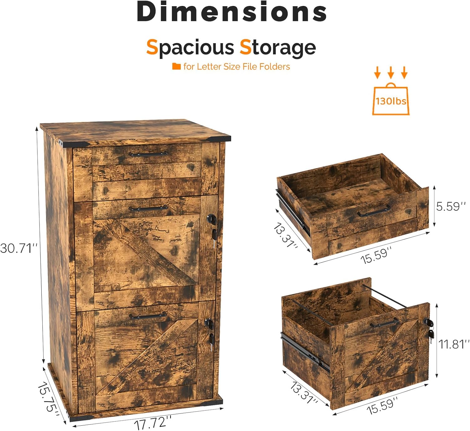 VINGLI 3 Drawer File Cabinet with Lock, Home Office Filing Organizer, for Letter Size File Folder Storage, Modern Farmhouse Style, Wood Vertical Filing Cabinet, Archivador (Rustic Brown)