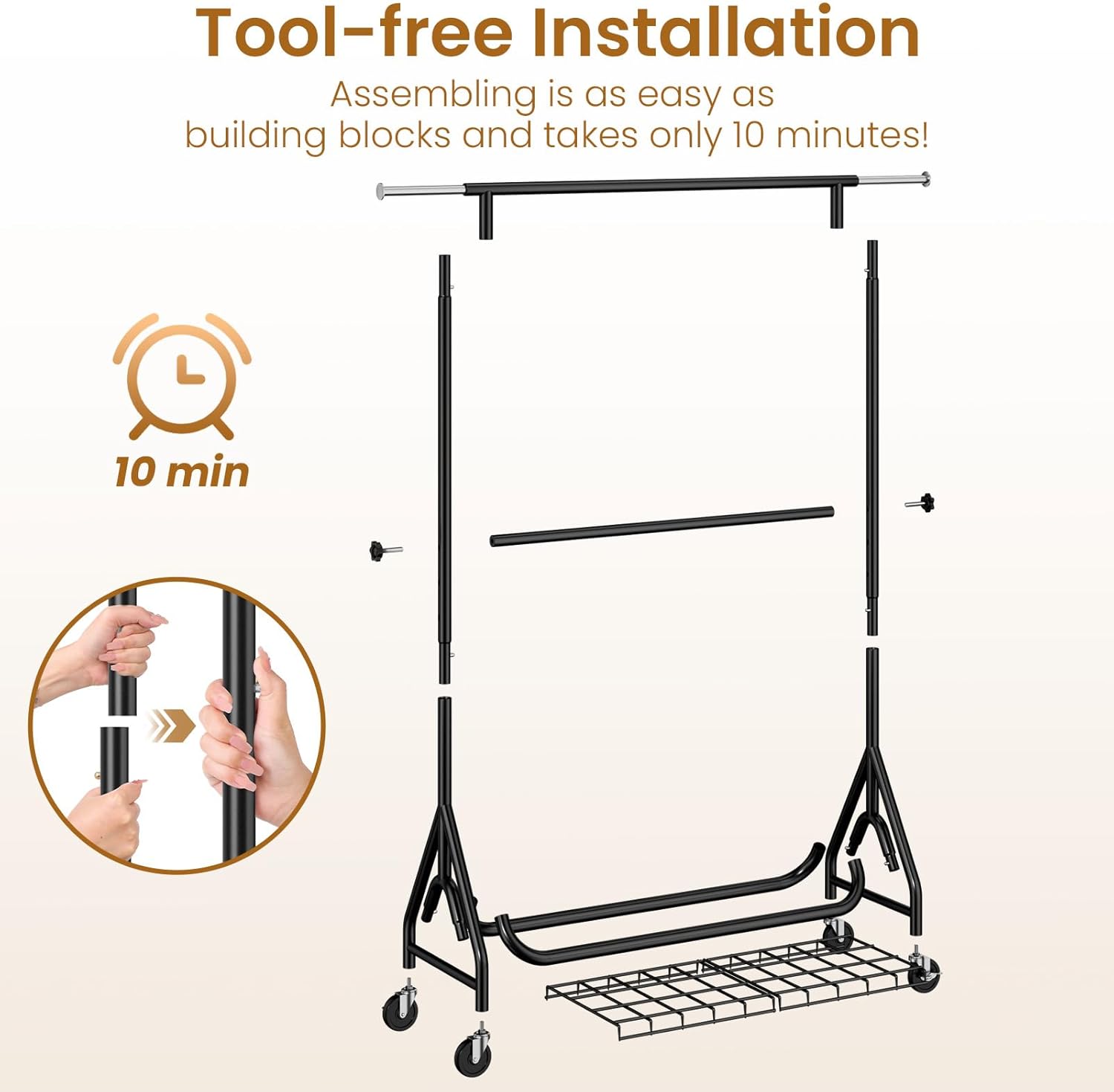 Heavy Duty Clothes Rack for Hanging Clothes, Double Rods Clothing Rack with Lockable Wheels, Rolling Garment Racks with Shelf, Easy to Assemble, Black