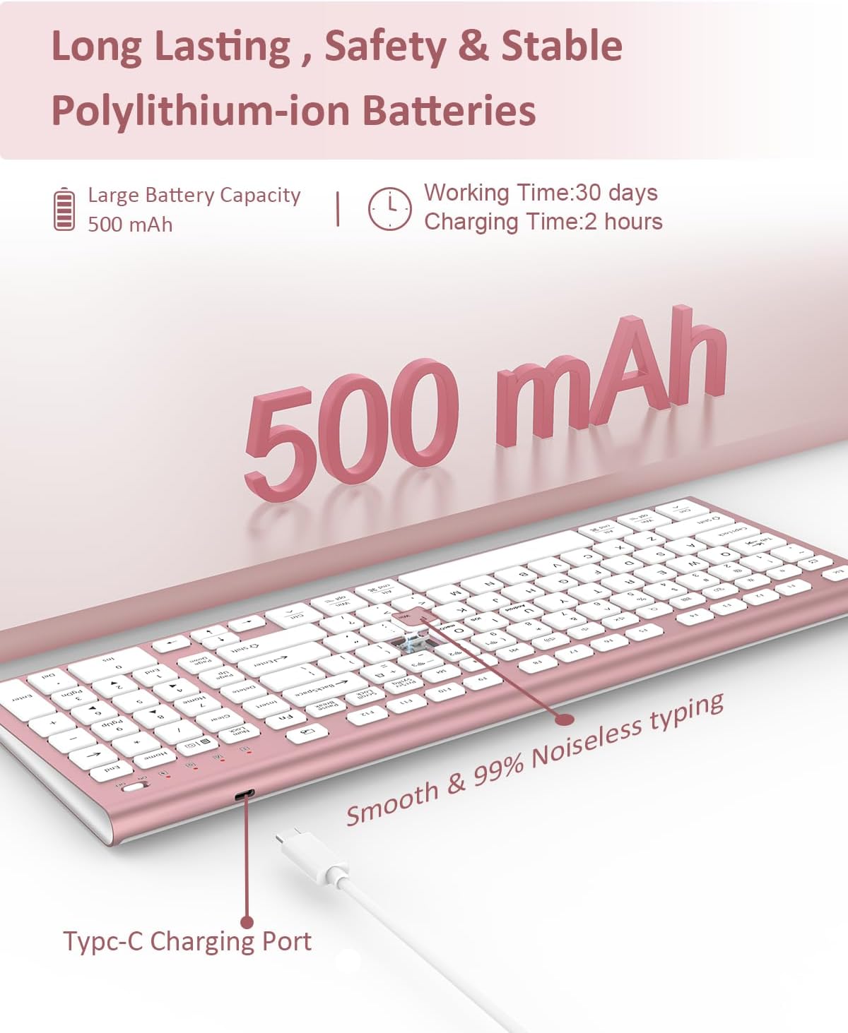 - 【Environmental Protection and Energy Saving】:Never worry about running out of power again! Our high-capacity long-lasting rechargeable battery. The battery capacity is about twice that of most standard wireless keyboards.No more tossing out disposable batteries; it’s eco-friendly and cost-saving. Type C charging port, charging takes about 1.5 hours, with a usage time to about 60 days (depending on usage habits). The smart low-battery reminder ensures you’re always prepared, whether you’re working on a cross-country flight or a long study session.