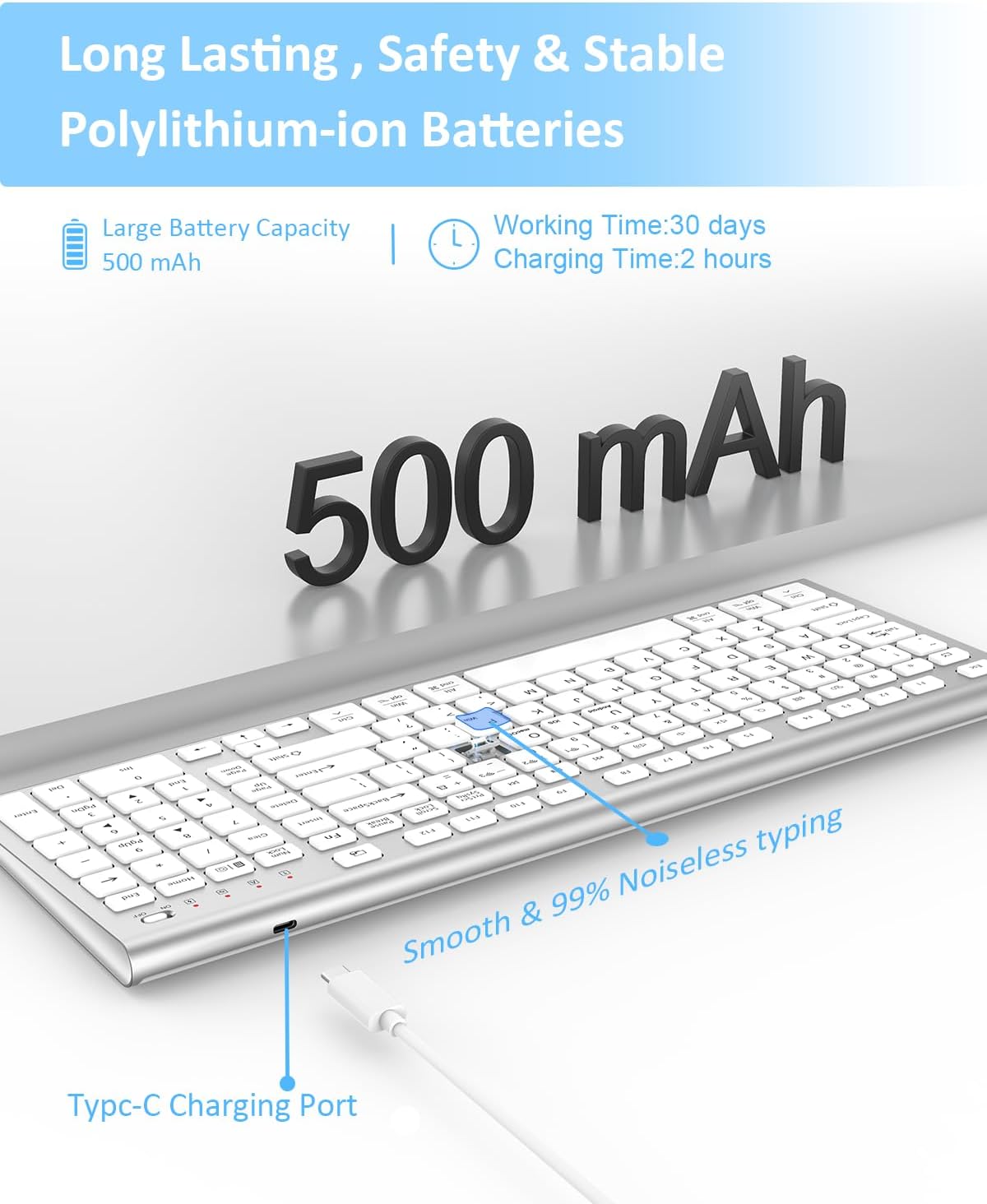 FENIFOX Wireless Keyboard, Bluetooth + USB Ergonomic Silent Quiet Rechargeable with Number Pad Compact Full Size Multi Device Keyboards for iPad Tablet Mac Computer Surface PC MacBook Laptop Silver