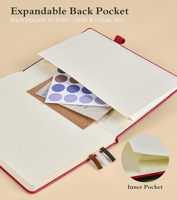 - 【Smart Organizational Features】:Crafted from soft vegan leather, this 5.8" x 8.5" A5 journal includes 1 elastic pen holder (keeps your writing tool handy), 2 elastic closures (secures pages tightly), 3 colored ribbon bookmarks (mark key sections), and 1 inner pocket (stores loose papers or receipts).Lightweight and portable, it fits effortlessly into bags for on-the-go use.