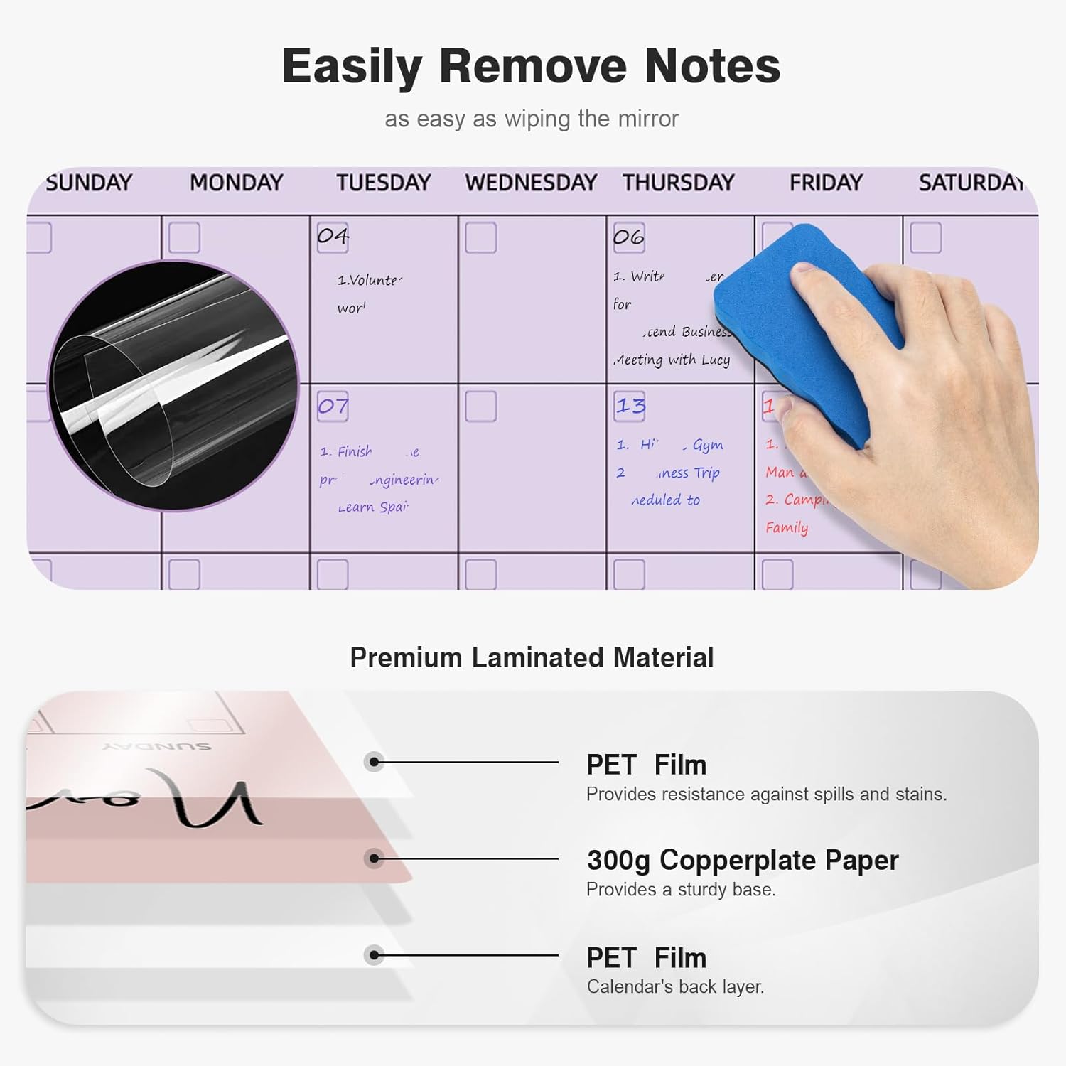 - ✨ Dry Erase Wall Calendar : is made of PET Film and 300 grams Copperplate Paper, providing a durable surface that resists scratches and smudges, while the sturdy Copperplate Paper backing keeps it in place without curling.