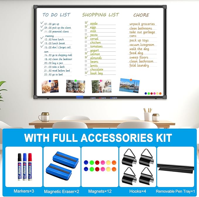 - ✔ Premium Durability – Unlike flimsy cardboard-core whiteboards, our sturdy wooden core resists warping, dents, and creases for long-lasting use. Black aluminum frame with ABS corner guards prevents dings.