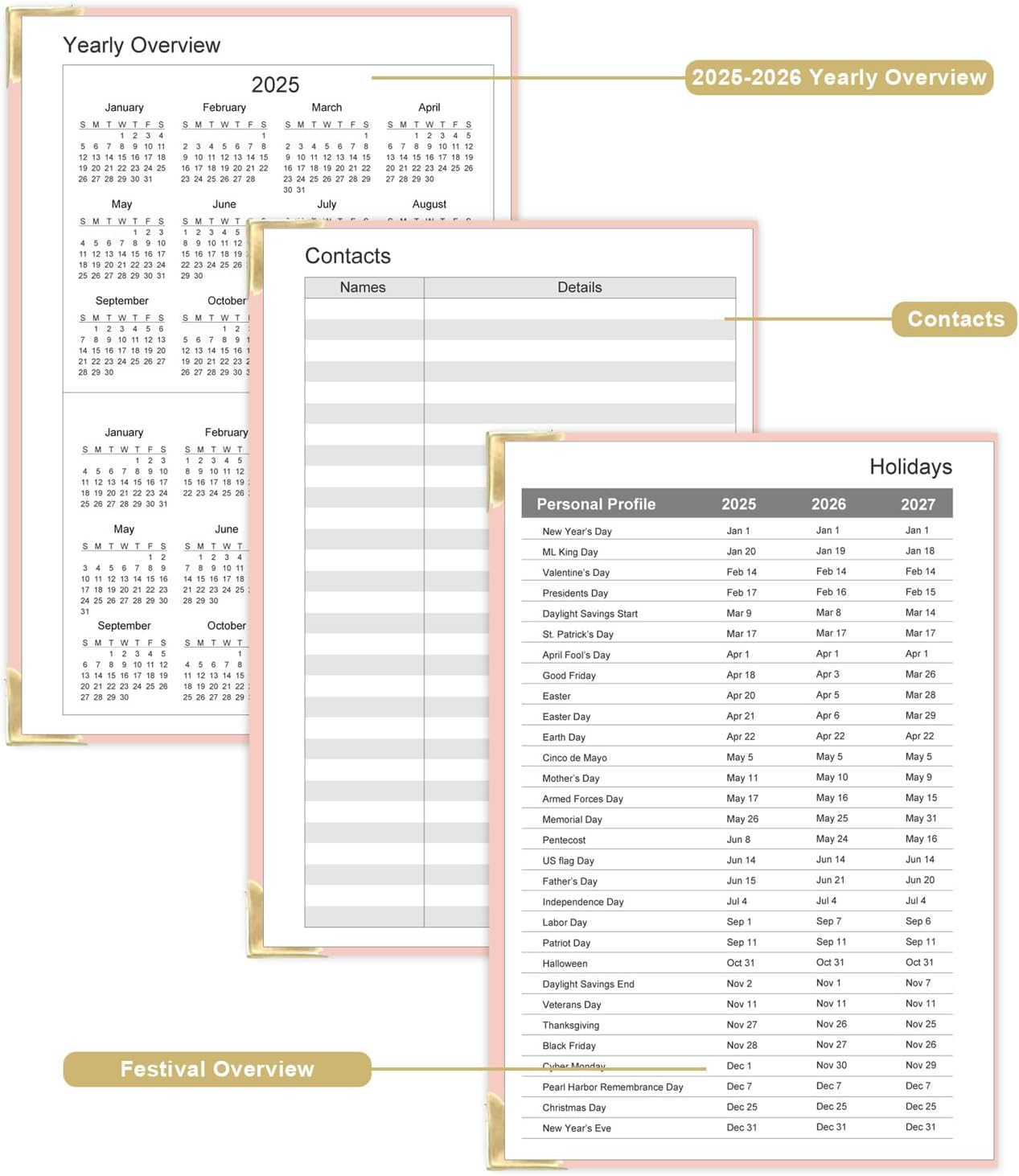 - 224 SHEETS / 448 PAGES - This undated planner measures 5.8 x 8.5 inches, a comfortable size for daily use and carrying. The planner notebook includes a Yearly Overview, Personal Information, Contacts, Important Dates, Monthly Pages, Daily Pages, Notes Pages, and a festival overview page covering 2025-2027. It comprehensively contains everything needed for daily use.