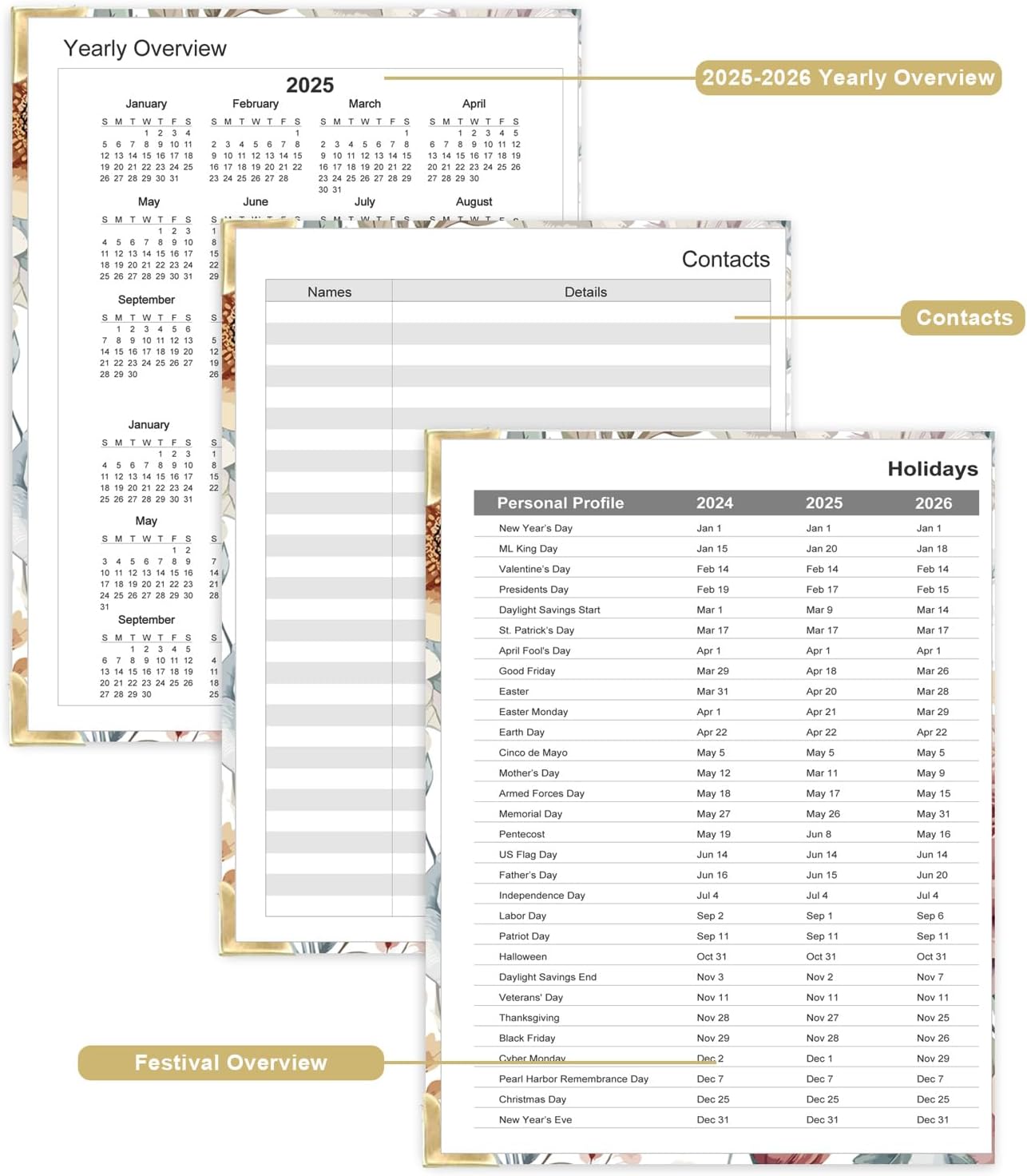 - 224 SHEETS / 448 PAGES - This undated planner measures 8.5 x 11 inches, a comfortable size for daily use and carrying. The planner notebook includes a Yearly Overview, Personal Information, Contacts, Important Dates, Monthly Pages, Daily Pages, Notes Pages, and a festival overview page covering 2025-2027. It comprehensively contains everything needed for daily use.