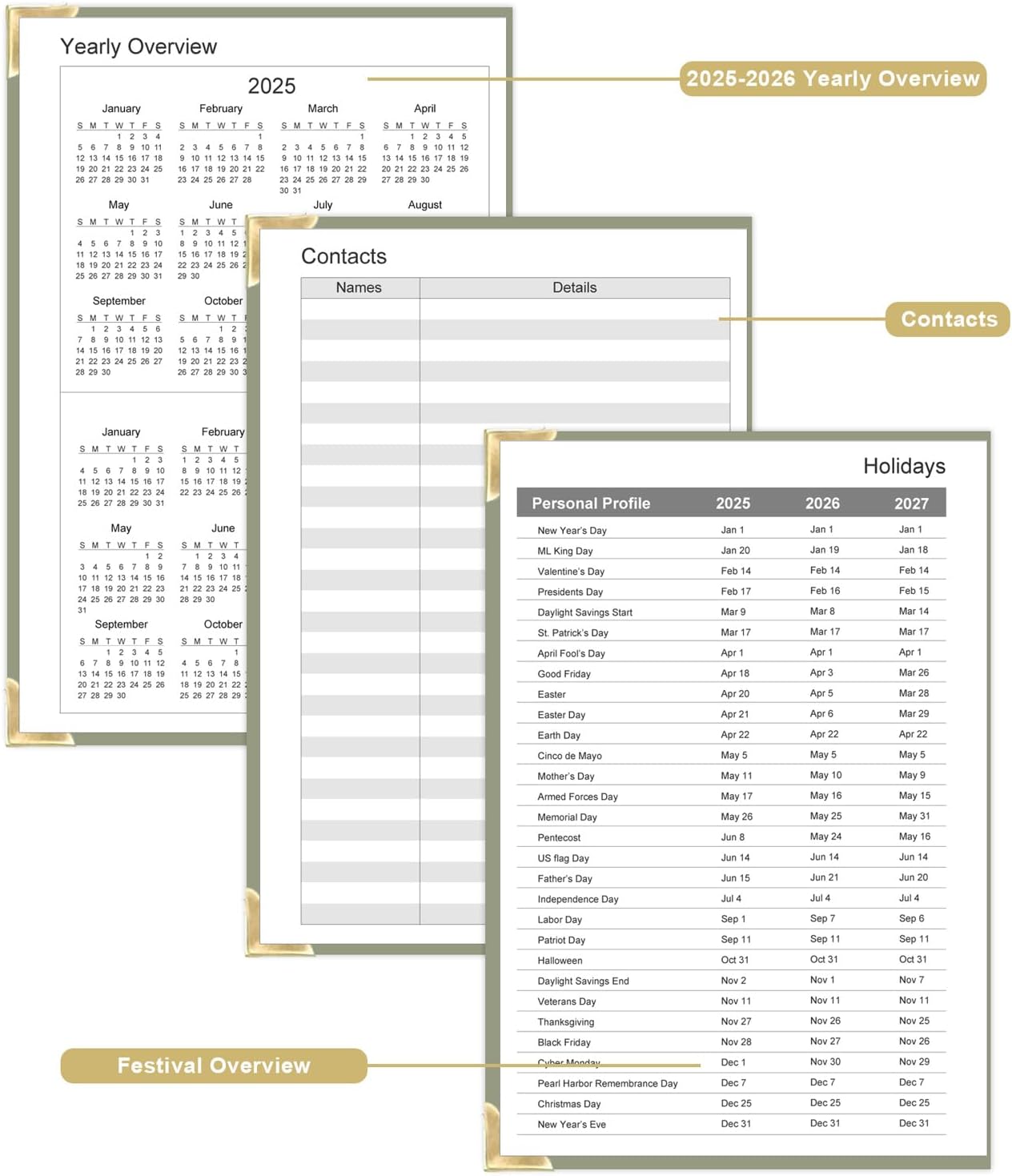 - 224 SHEETS / 448 PAGES - This undated planner measures 5.8 x 8.5 inches, a comfortable size for daily use and carrying. The planner notebook includes a Yearly Overview, Personal Information, Contacts, Important Dates, Monthly Pages, Daily Pages, Notes Pages, and a festival overview page covering 2025-2027. It comprehensively contains everything needed for daily use.