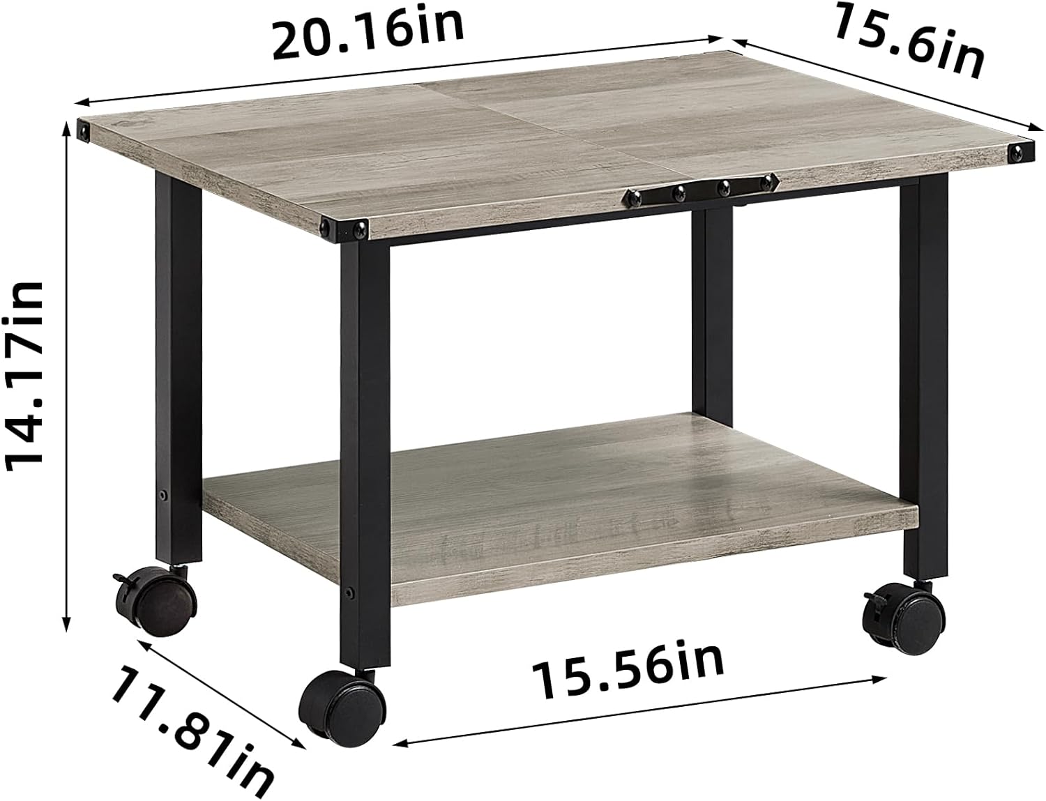 - [Sturdy & Durable] Overall Size : 20.16 "L X 15.6''W X 14.17''H. Metal corners are decorated on the four corners, which is both beautiful and protect the corners of the table. The industrial printer cart is made of sturdy steel tube frame and thick wood boards as support, which can firmly support the items placed on the printer shelf. Its excellent weight capacity is up to 100 lbs. It also provides excellent stability to ensure long life and durability.