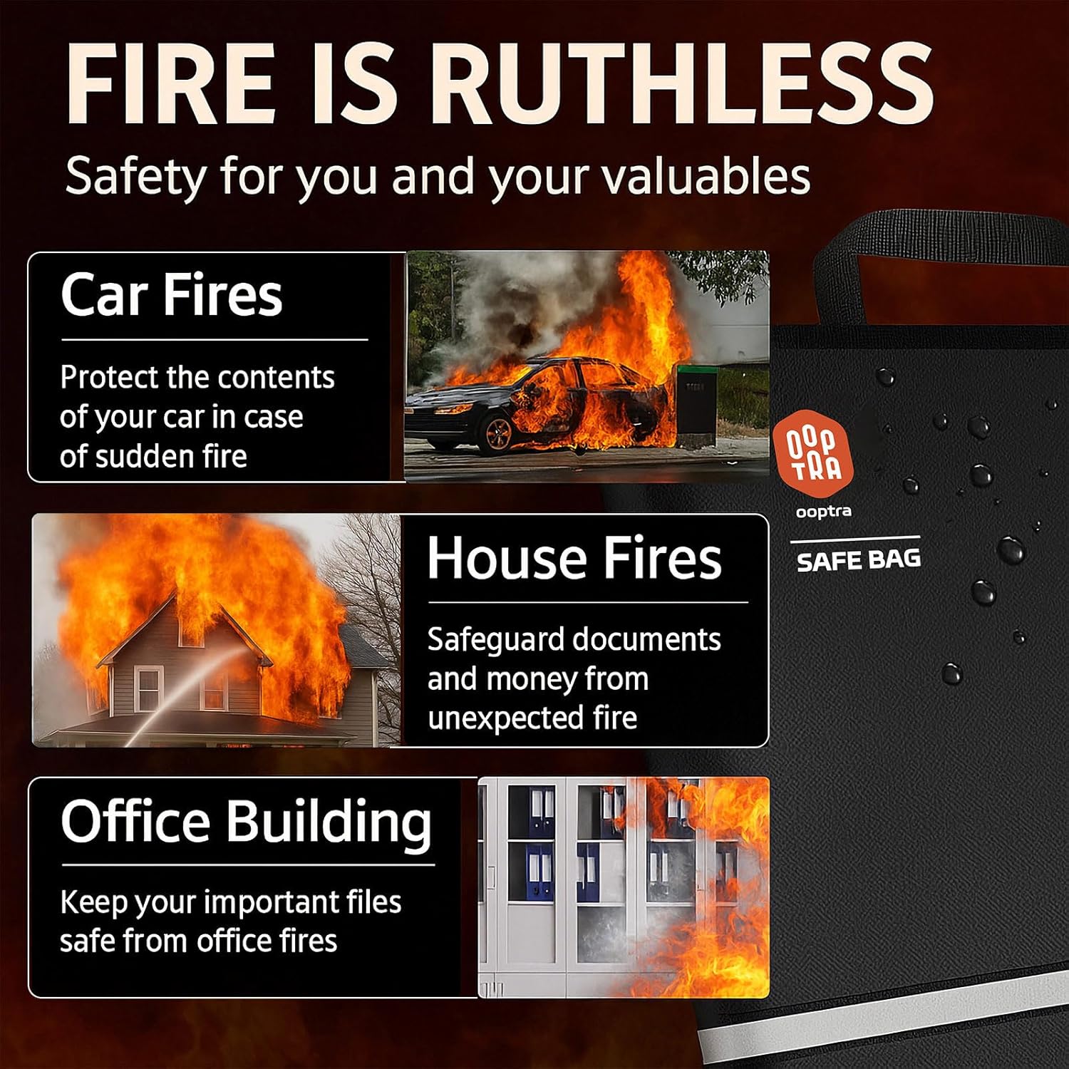 - 【Advanced 11-Layer Fireproof, Waterproof & Reflective Design】 Built with a new 11-layer fire-resistant structure and silicone-coated fiberglass, each bag offers enhanced protection—resisting heat up to 4200°F (short-term) while keeping out water, moisture, and smoke. The waterproof zipper further seals your valuables, and a full-length reflective strip ensures visibility in low light or emergencies.