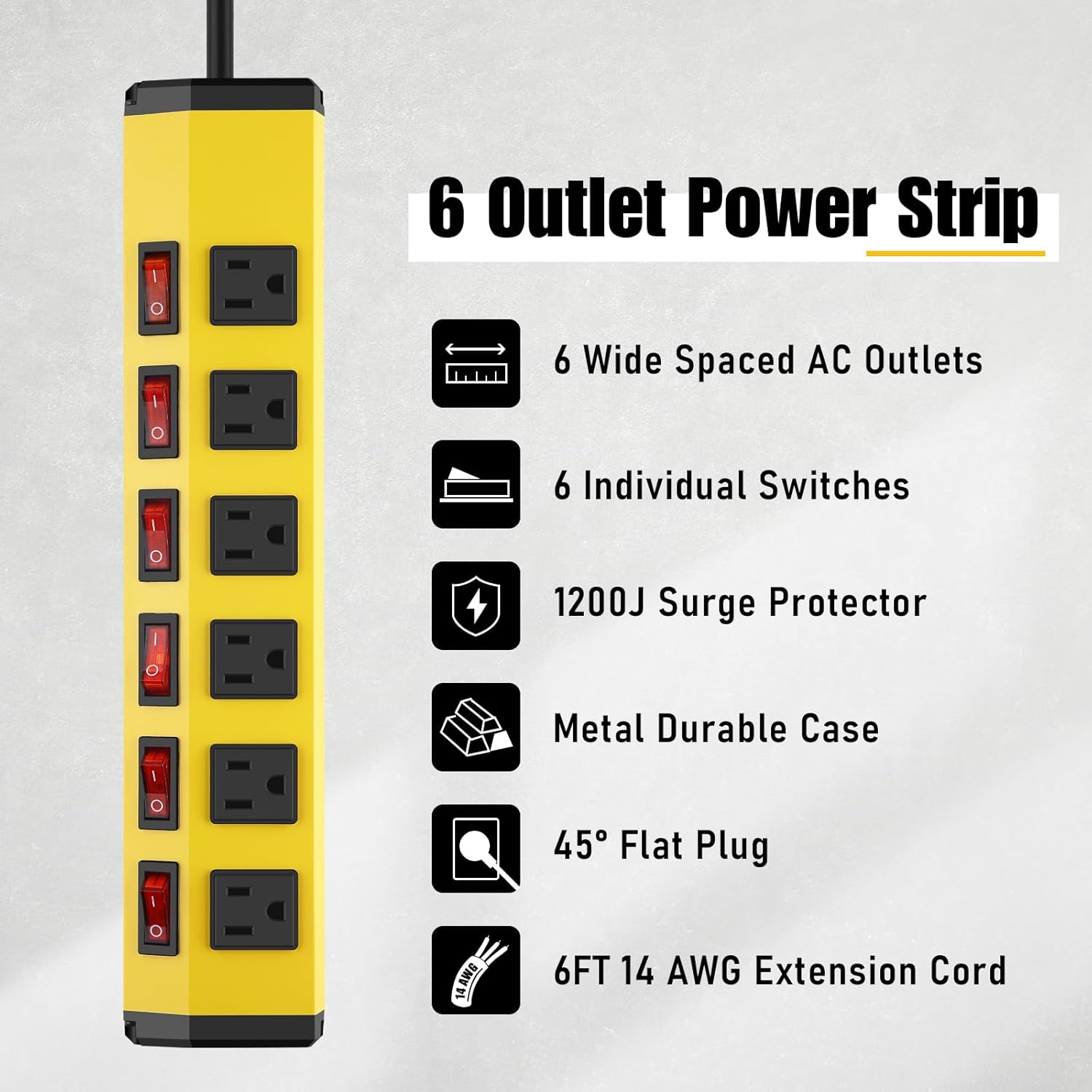 - Built-in 1200J surge protector MOV module, the individual switch power strip provides comprehensive protection for your valuable appliances. Say goodbye to worries about overload and voltage spikes.