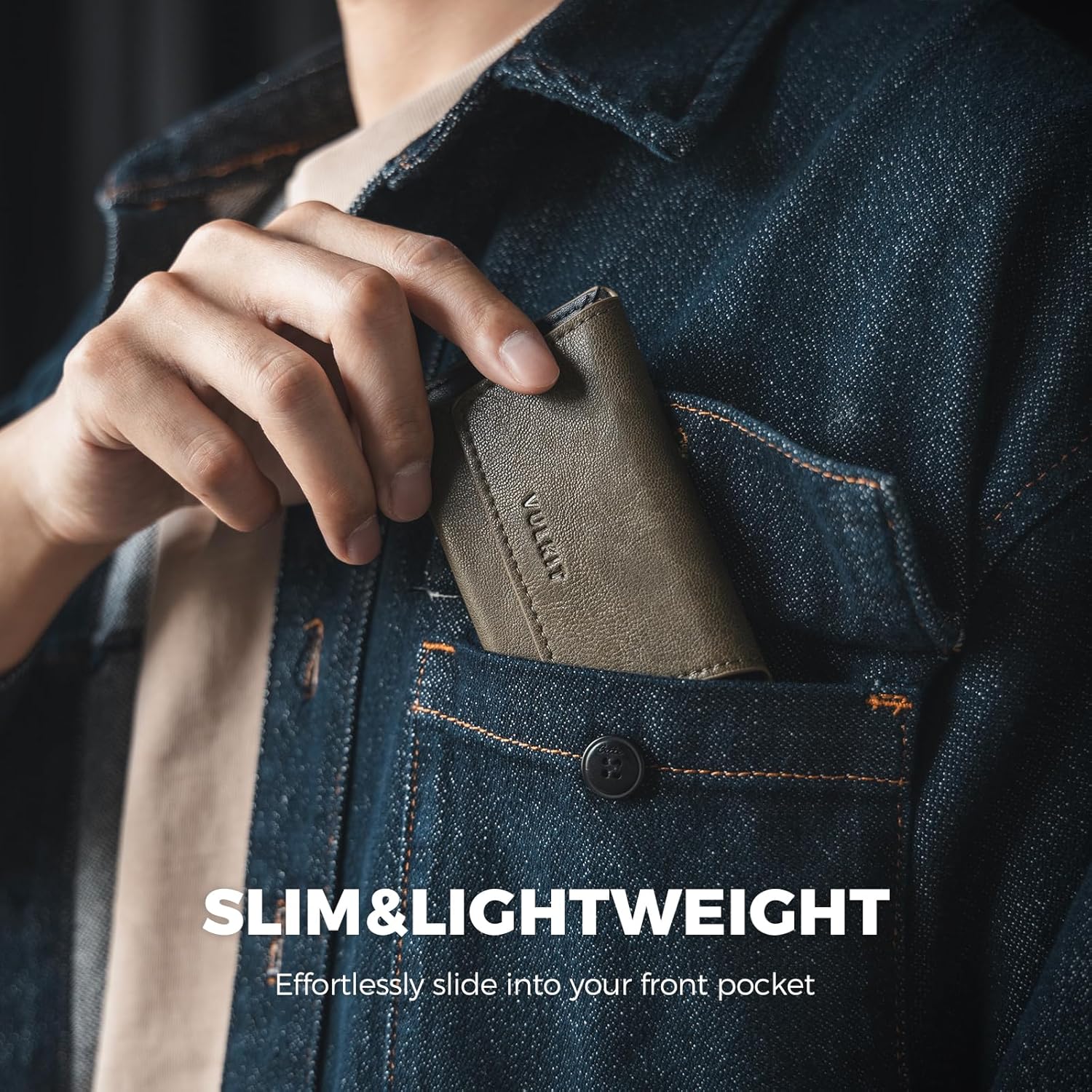VULKIT Leather Business Card Holder Case for Men Slim Pocket Business Card Wallet Name Card Case Holder, Holds 20 Business Cards Olive