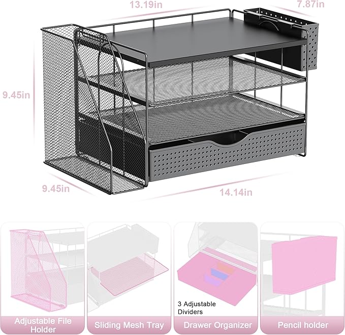 - 【Improve Work Efficiency】: This pen organizer contains 4 trays, 1 magazine rack, 1 pen holder, and 1 sliding drawer, which can help you quickly identify the contents of each compartment, helping to keep papers, notebooks, and office supplies neatly organized and easily accessible., so that you can stay busy and creative all day long.