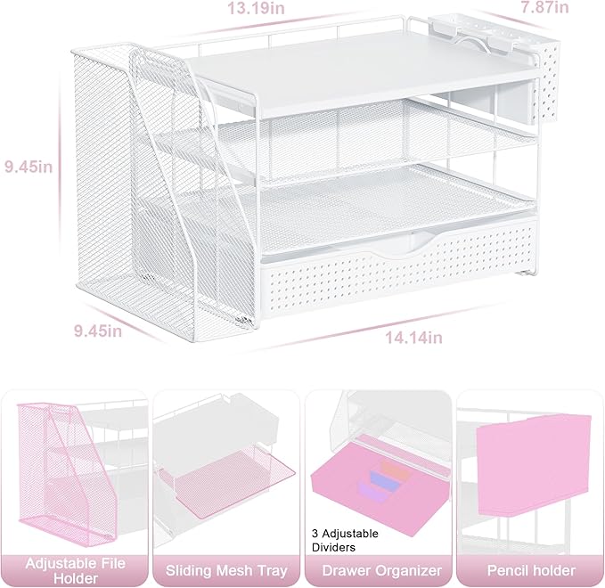 - 【Improve Work Efficiency】: This pen organizer contains 4 trays, 1 magazine rack, 1 pen holder, and 1 sliding drawer, which can help you quickly identify the contents of each compartment, helping to keep papers, notebooks, and office supplies neatly organized and easily accessible., so that you can stay busy and creative all day long.