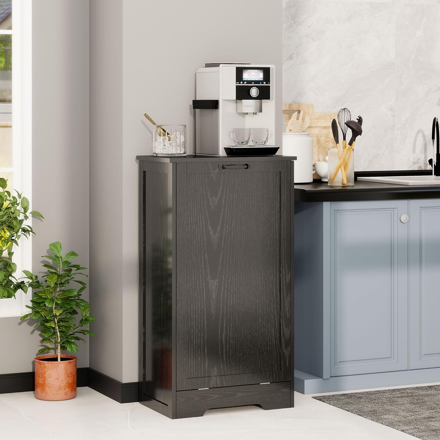 Tilt Out Kitchen Trash Can Cabinet, Pet Proof Wooden Kitchen Garbage Can with Lid, Hidden Laundry Basket Organizer, 10 Gallon Free Standing Bathroom Laundry Hamper Cabinet, Black
