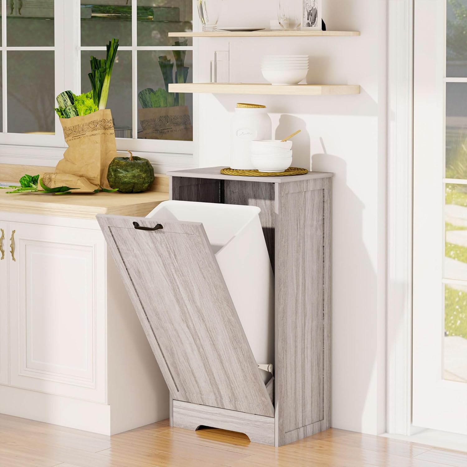 Tilt Out Trash Can Cabinet, Wooden Dog Proof Trash Can Cabinet Laundry Hamper, Hidden Large Recycling Bins for Kitchen, Living Room, Bathroom, Wash Grey