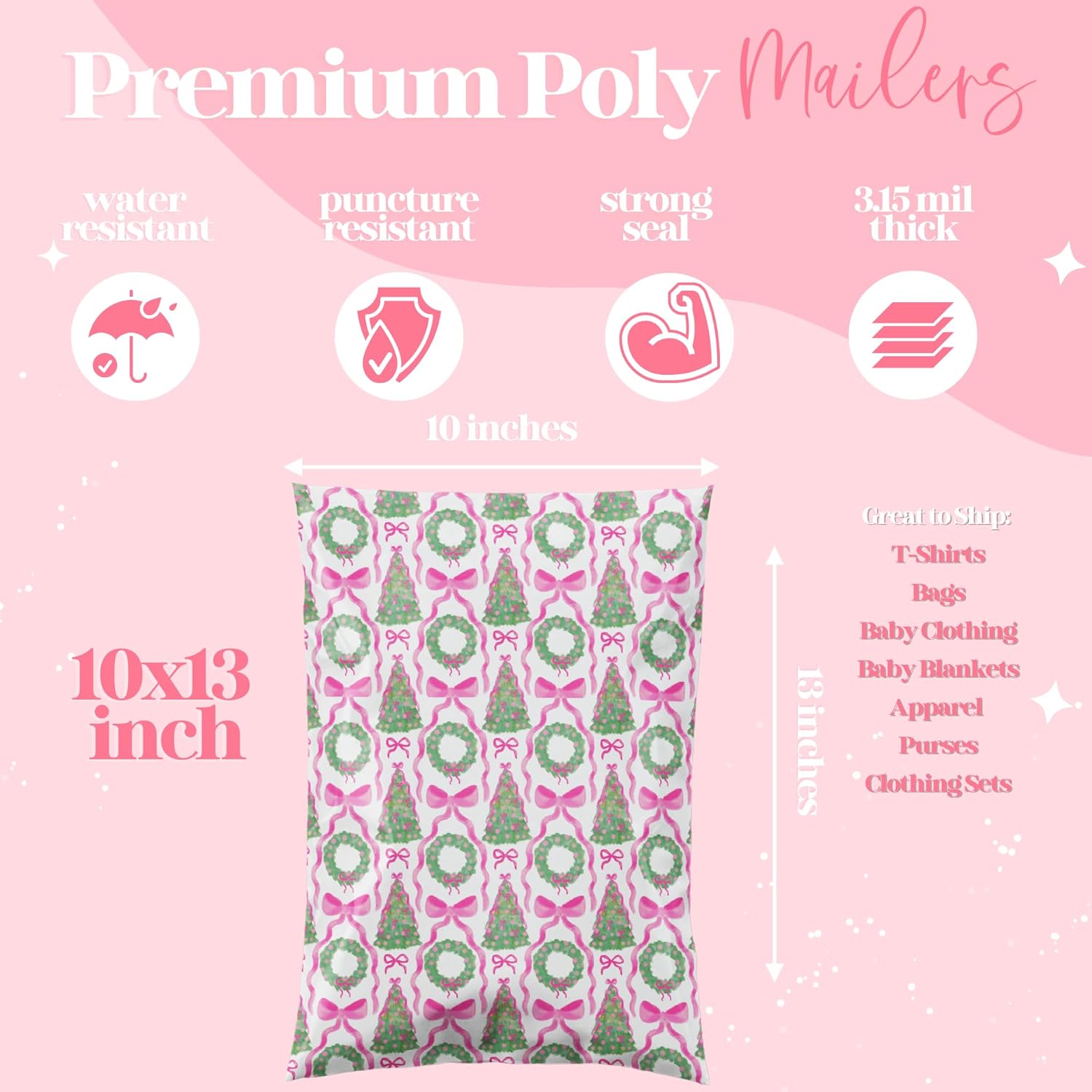 10x13 Designer Poly Mailer 100 Pack Heavy Duty Waterproof Self Seal Shipping Bags for Small Business Large Mailing Envelopes Bulk Tear Resistant Packaging Coquette Christmas Holiday Bows