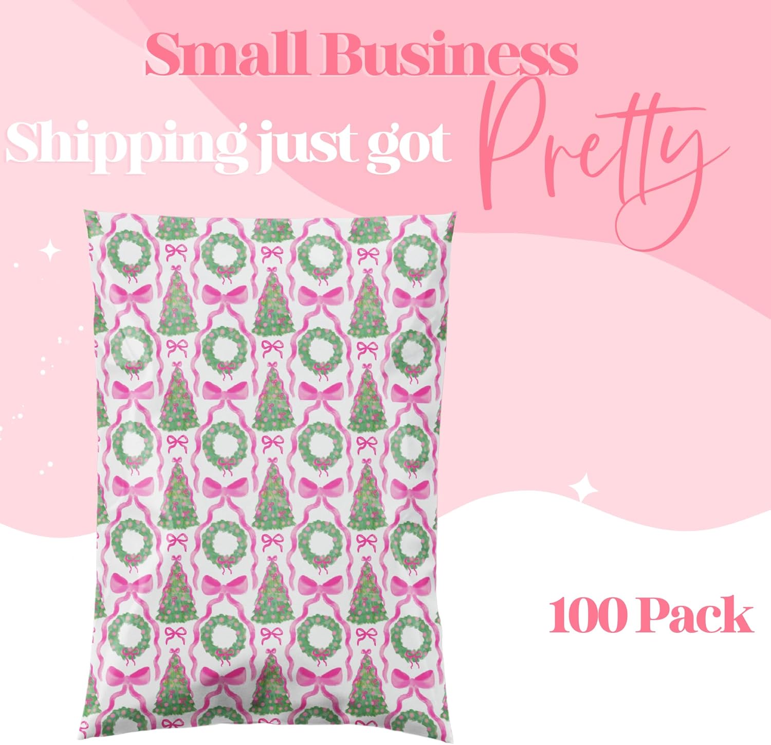 6x9 Designer Poly Mailer 100 Pack Heavy Duty Waterproof Self Seal Shipping Bags for Small Business Large Mailing Envelopes Bulk Tear Resistant Packaging Coquette Christmas Holiday Bows