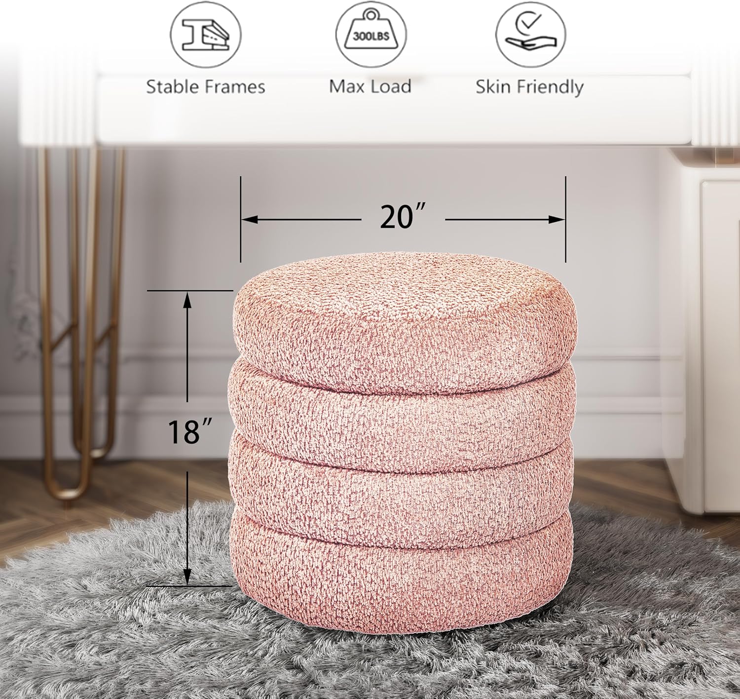 - 【Stability and Safety:】 The Upholstered Vanity Stool is equipped with a sturdy frame and filled with high-quality foam, ensuring it can support up to 260 pounds. It has protective, invisible rubber feet to help prevent sliding and protect your floors.