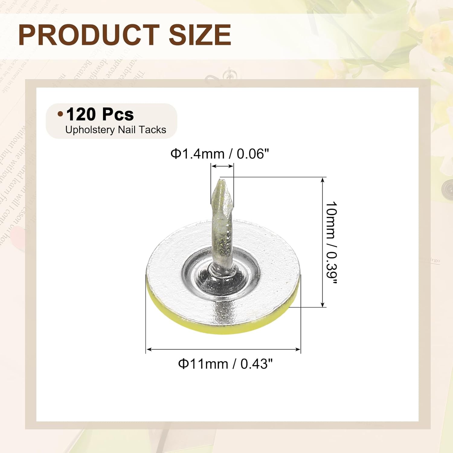 - [Size & Quantity] - The package comes with 120pcs decorative upholstery tacks. Sufficient quantity to meet your different daily needs. The overall size of upholstery nails is about 11mm x 10mm/0.43-inch x 0.39-inch(D*H)