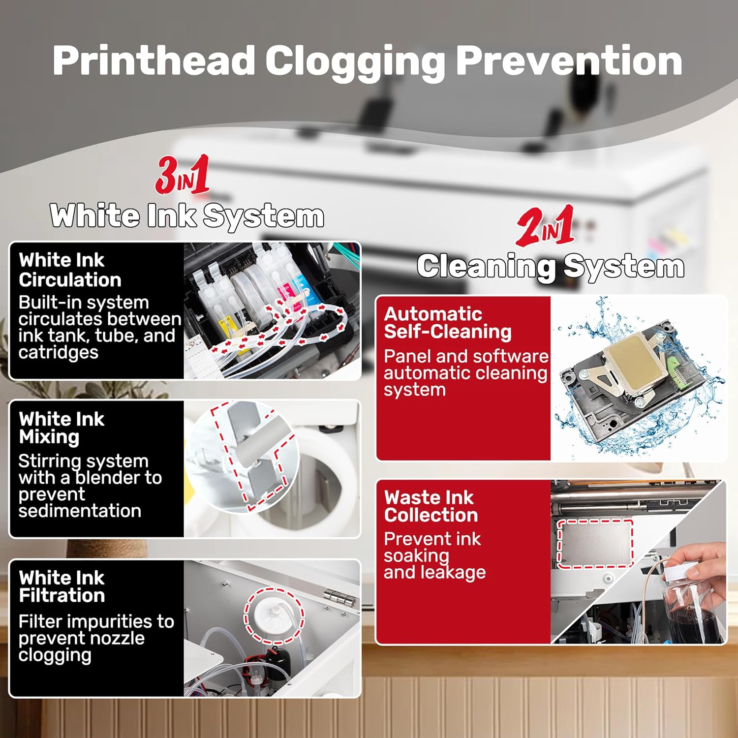 - ✅[Printhead Protection System] 3-in-1 white ink circulation, mixing, and filtering with CISS (Continuous Ink Supply System) to prevent the printhead from being clogged by white ink. The moisturizing device ensures that even if the printer is not used for a long time, the inside of the printhead can still remain moist to prevent clogging.