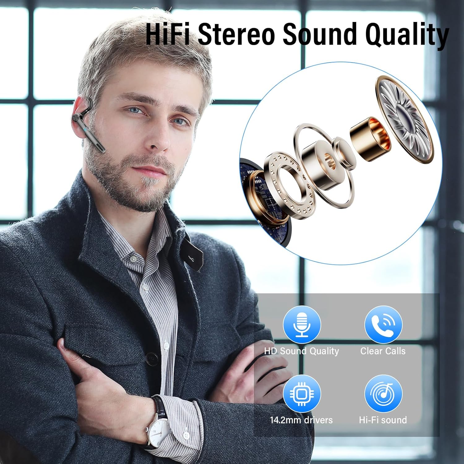 - Noise reduction and HD calling technology: The bluetooth earpiece is equipped with environmental noise control technology, which passively eliminates 75% of background noise, ensuring clear calls and an immersive music experience. These wireless headset features low-distortion 14.2 mm composite dynamic drivers with built-in high-resolution codecs and AAC and SBC audio encoding technology.