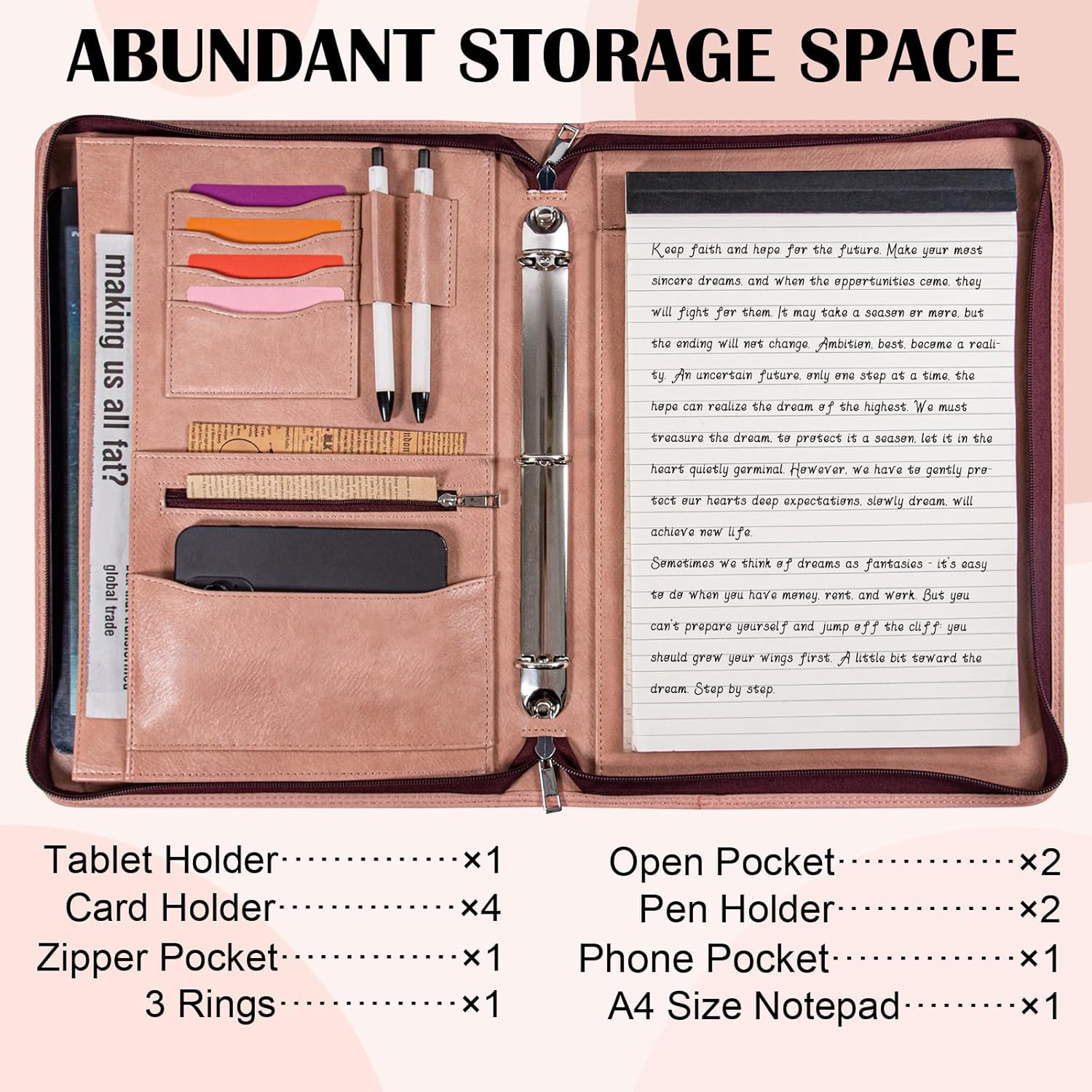 Calfinder Pink Portfolio Binder,3 Ring Binder with Zipper,PU Leather Padfolio with Zipper for Women, Professional Business Portfolio Organizer for Resume/Interview, A4 Letter Document Organizer