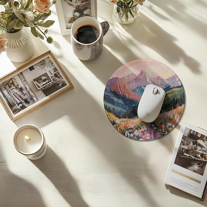 Boho Mountain Mouse Pad, Colorful Floral Watercolor Wildflower Nature Landscape Mousepad for Computer Laptop Office Desk Accessories,7.9x7.9,C069