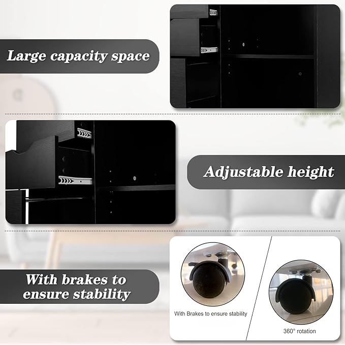 QDSSDECO 3-Drawer with Shelf Wood File Cabinet Mobile Lateral Filing Cabinet, with Rolling Wheel Printer Stand and Open Adjustable Storage Shelves, for Home Office, Black