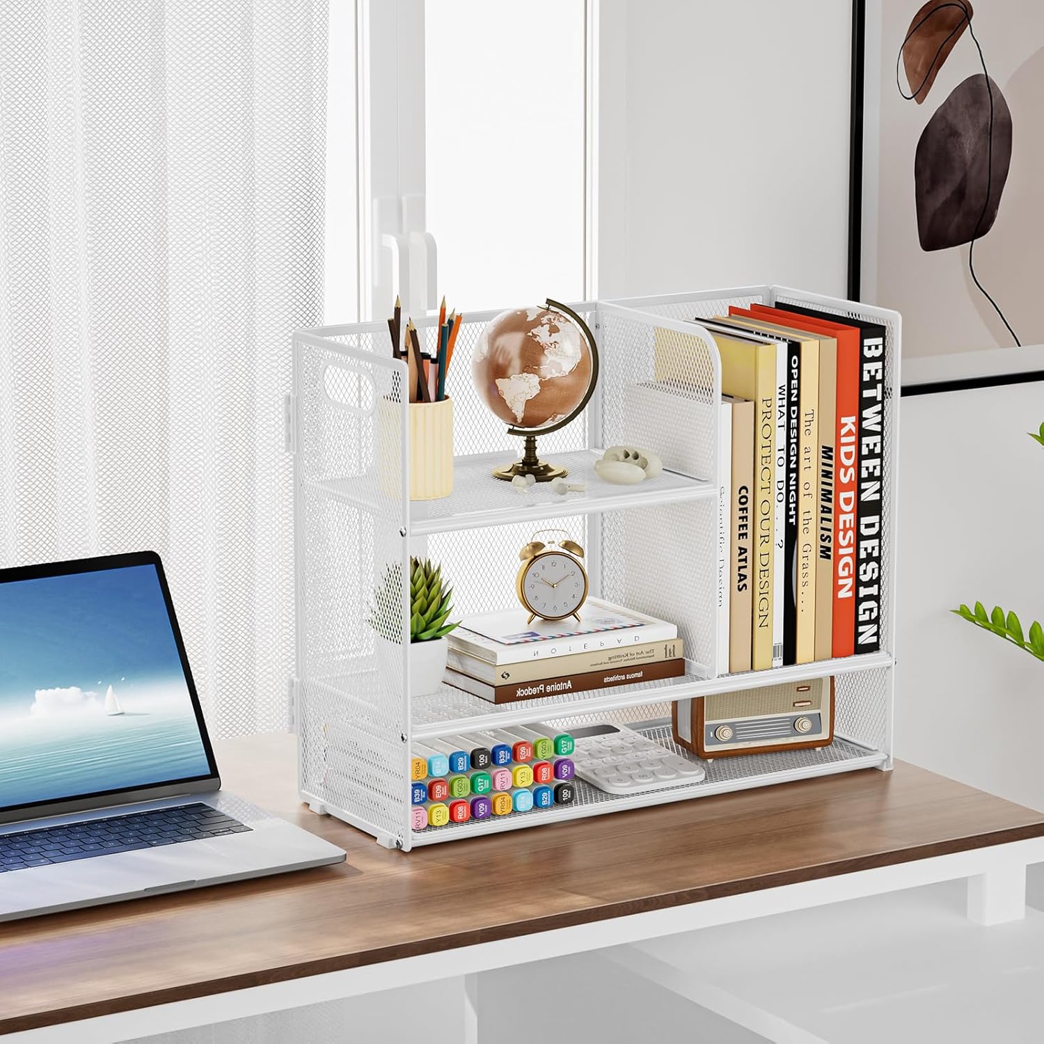 Marbrasse 3-Tier Desk Shelf Organizer with Handle, Desktop Bookshelf File Holder, Mesh Display Shelf Organizer Storage Rack for Office, Home, Supplies, Kitchen (White)