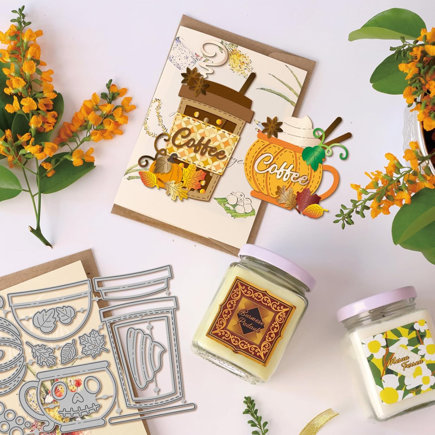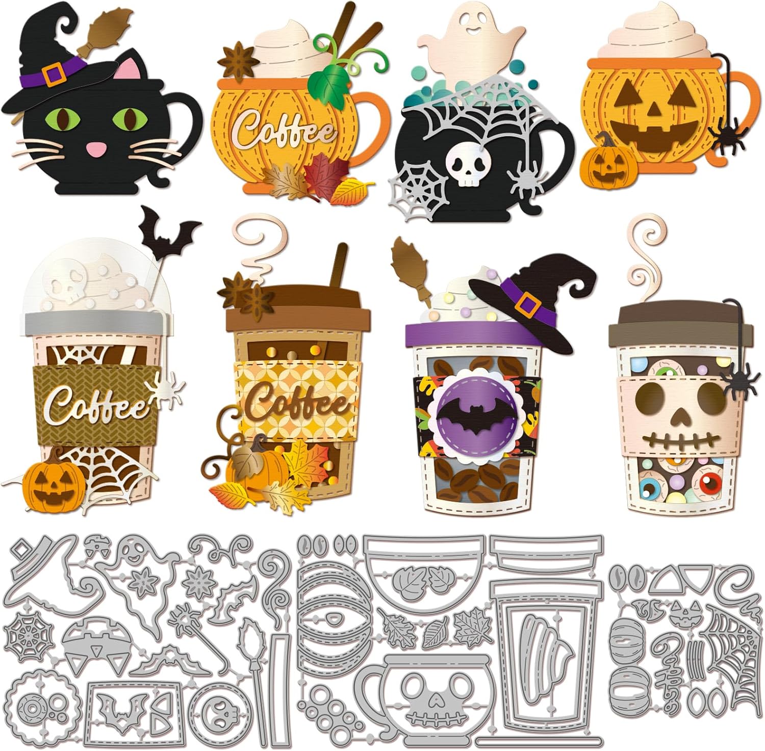- Halloween Coffee Cup Theme: The cut dies are designed with Halloween pumpkin coffee cup, cat, ghost, bat, hat, skull, eyeball patterns, you can use these cut dies to make unique card holder, multiple styles of die cuts can meet your DIY requirements