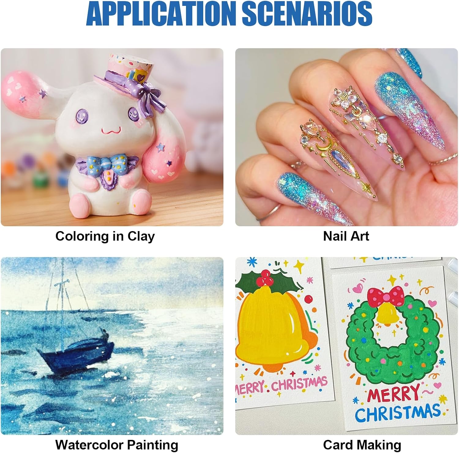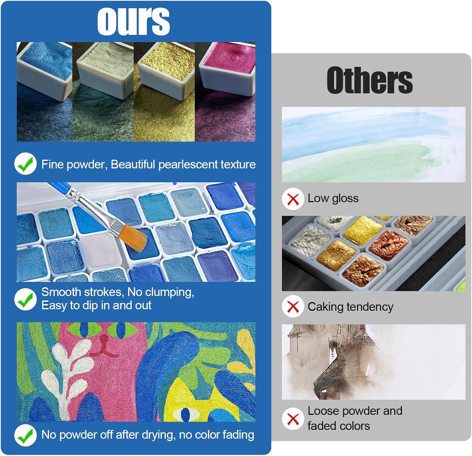 - 【Smooth Strokes, No Powder Off】Our watercolors paint set are extremely durability. Glitter watercolor remain highly stable, drying without crumbling or fading, making the watercolor painting shine forever. The fine powder texture makes the strokes of the pearl paint smooth and resists clumping