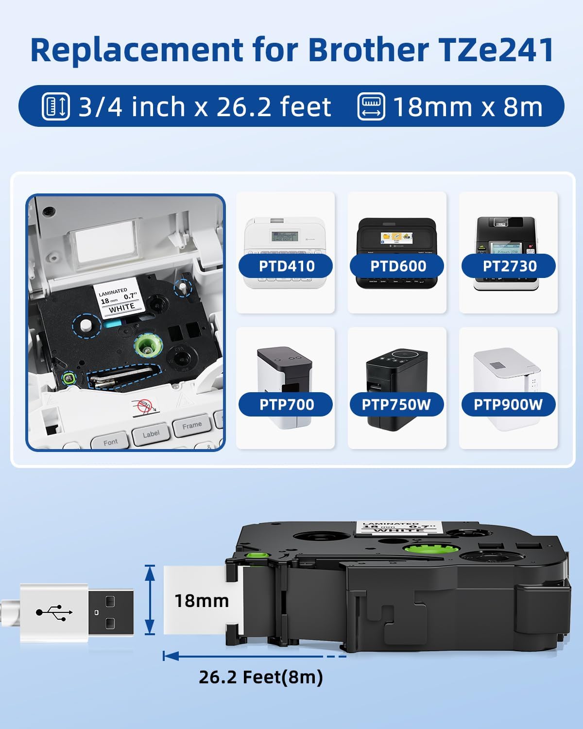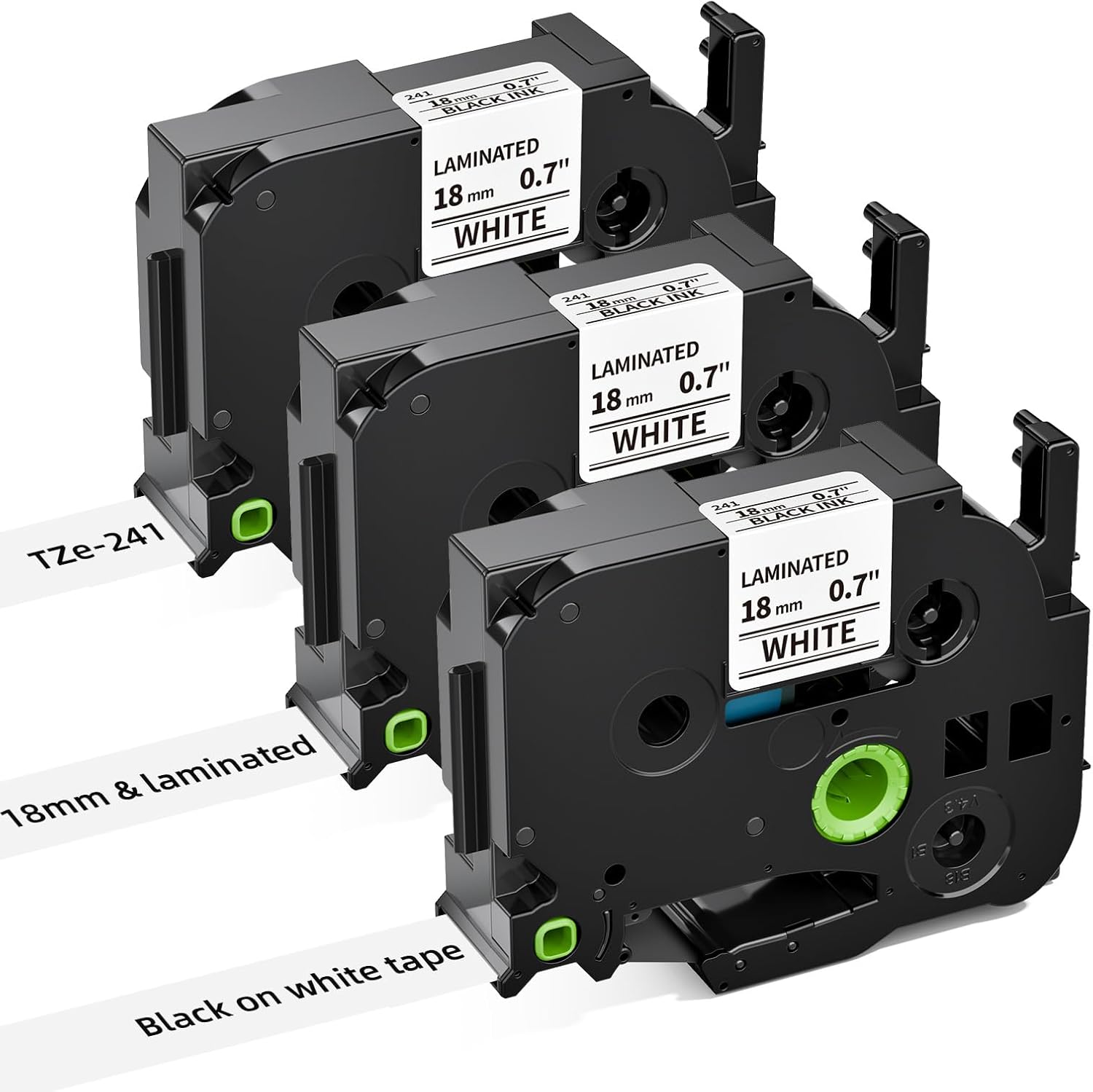 - Package included: 3-Pack compatible with Brother PTouch Label Tapes TZe-241/TZ-241/TZ241, Black on White, 0.7 Inch (18mm) x 26.2 feet (8m) for each tape