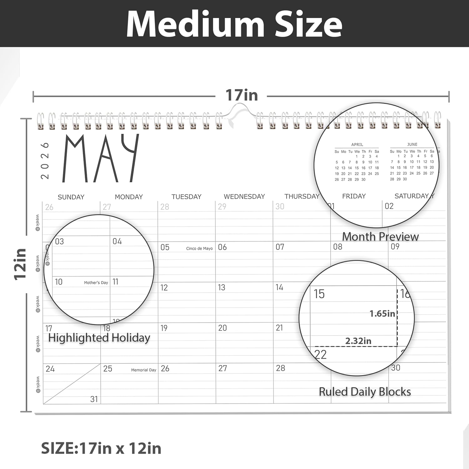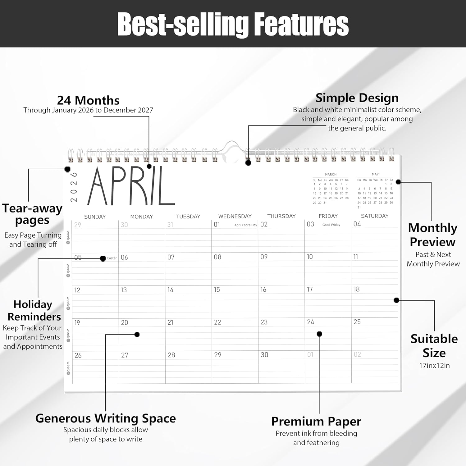 GuassLee Wall Calendar 2026, 24-Month Desk/Wall Calendar from Jan. 2026 to Dec. 2027,17" X 12" Desktop Hanging Monthly Planner with Thick Paper Spiral Bound for Easy Organizing