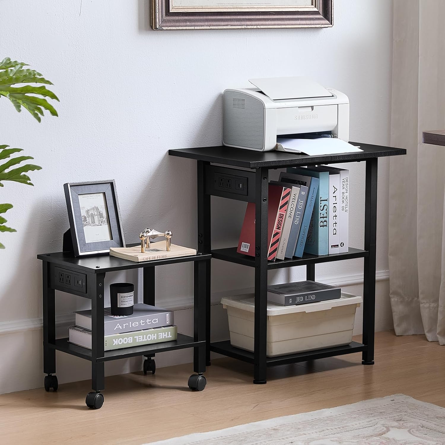 Lerliuo 3-Tier Printer Stand with Charging Station, Industrial Mobile Printer Table with Storage Shelf and Steel Frame, Rolling Printer Cart Holder with Lockable Wheels for Home, Office (Black)