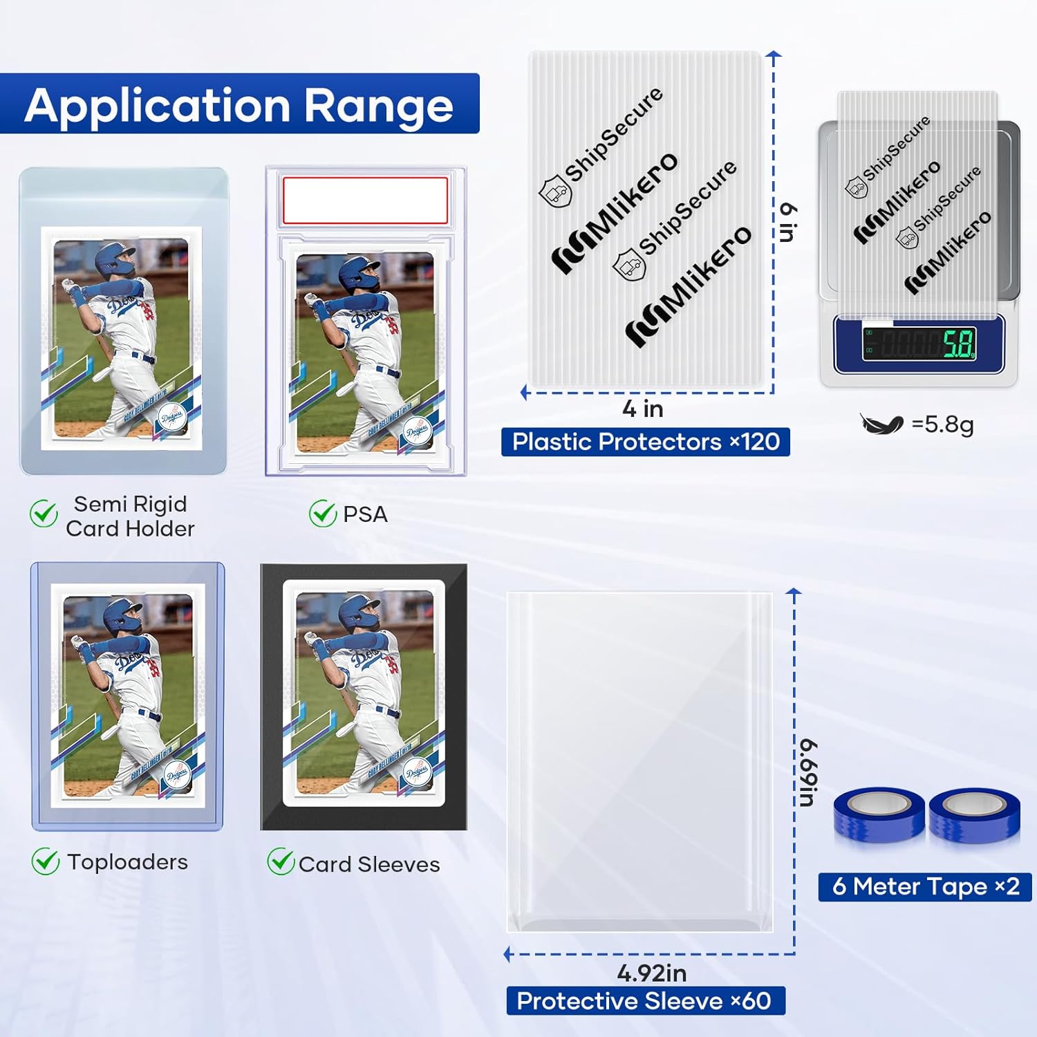 - [Multi-Layer Protection] Each set includes 120 trading card shipping protectors , 60 soft sleeves, and 2 rolls of 6-meter-long tape, offering multi-layer protection for your trading cards during mailing, storage, or transport.