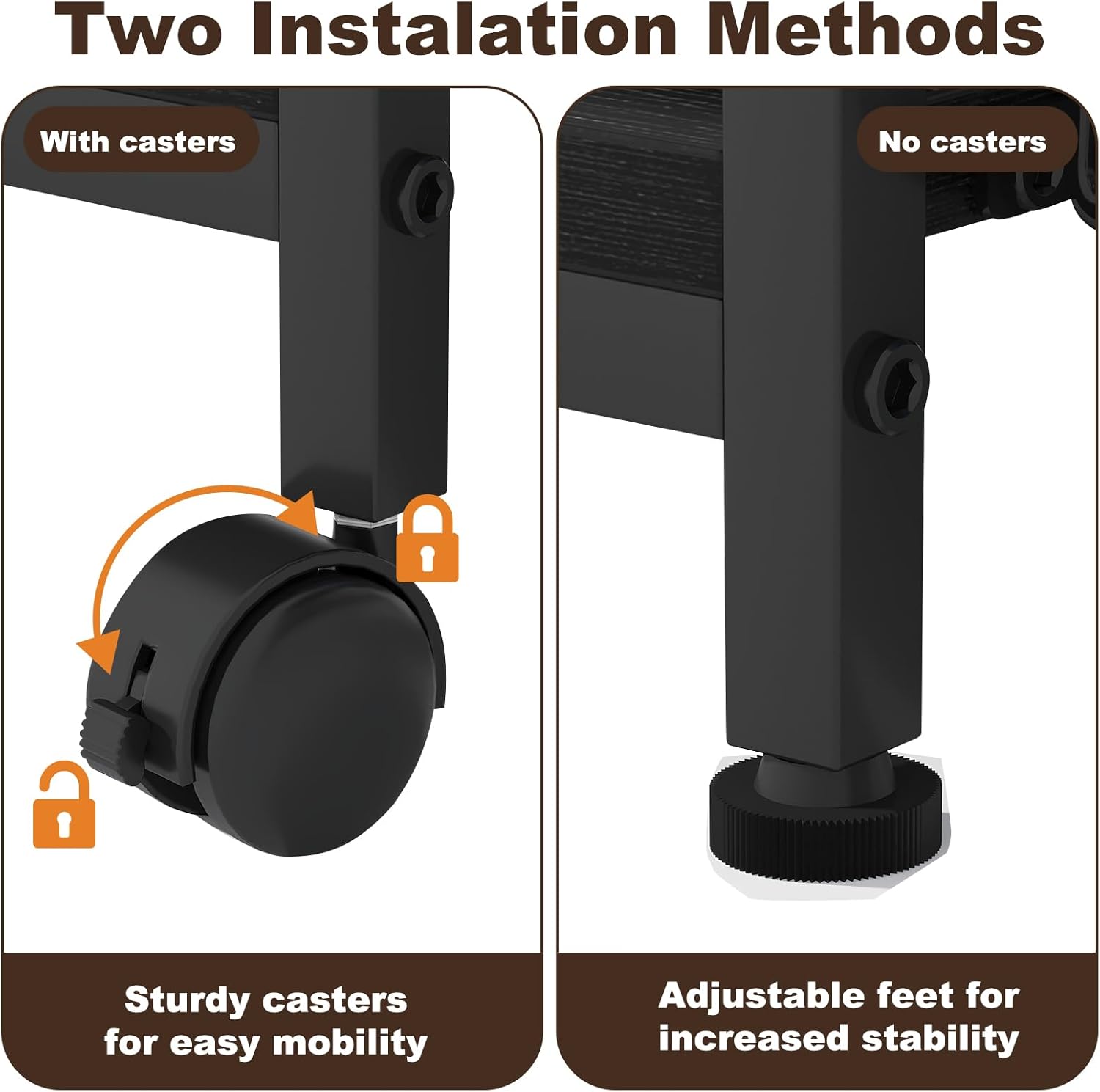 - Two Installation Options:The printer table can be used with or without wheels.Not only does it make it easy to move the printer around without having to manually lift it, but it also makes it easy to clean underneath the printer stand.