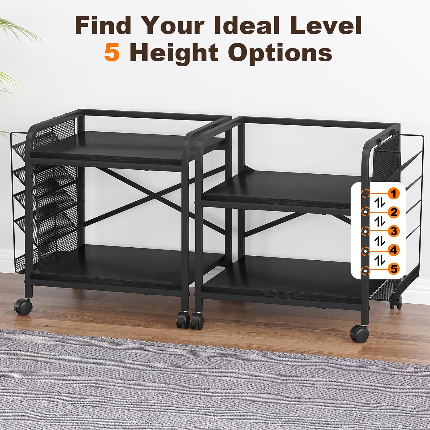 - 5 Adjustable Heights:The printer stand has five adjustable heights to accommodate your different printer size types.Conveniently storing multiple printers, making full use of vertical space to efficiently organize and store your items.