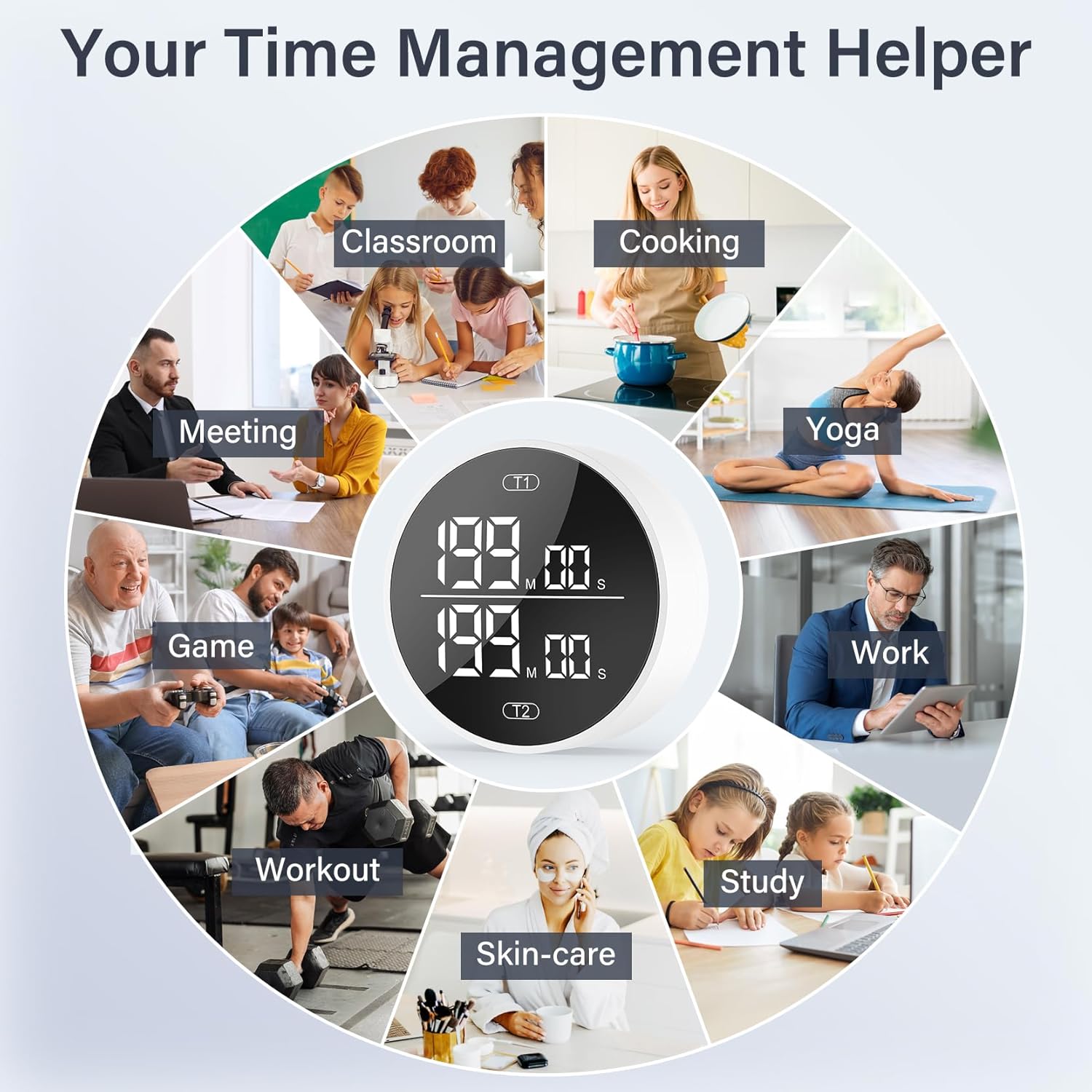 - Dual Channel Kitchen Timer: This device allows 2 timers to work simultaneously without interfering with each other, perfect for multitasking in the kitchen. Featuring a countdown and stopwatch function that can be used simultaneously on the same screen, it is ideal for various scenarios such as cooking, studying, working, meetings, sports, skincare, gaming, and more. The countdown can be set for up to 199 minutes and as low as 5 seconds, while the stopwatch function can track up to 199 minutes and 59 seconds.