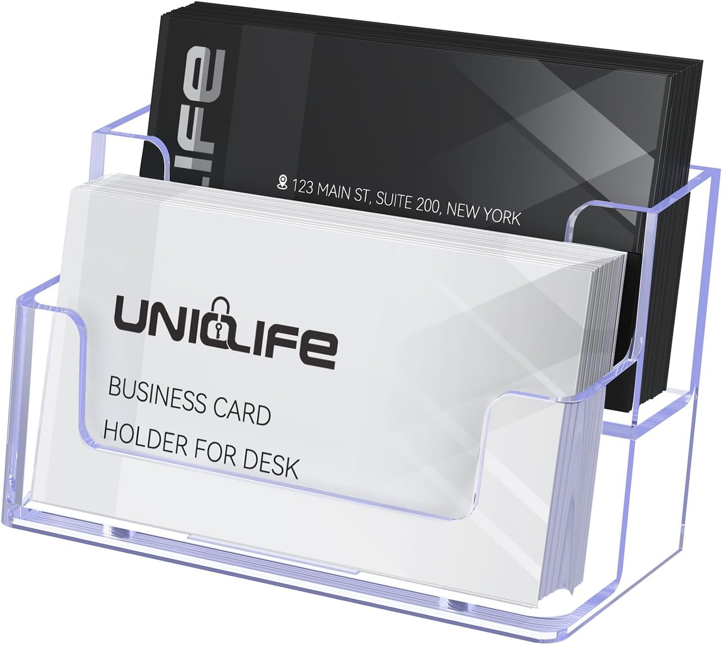Uniclife Acrylic Business Card Holder for Desk 2 Slots Clear Business Card Display Stand for Men & Women Desktop Business Card Organizer Card Stand for Office Home Exhibition, 120 Card Capacity