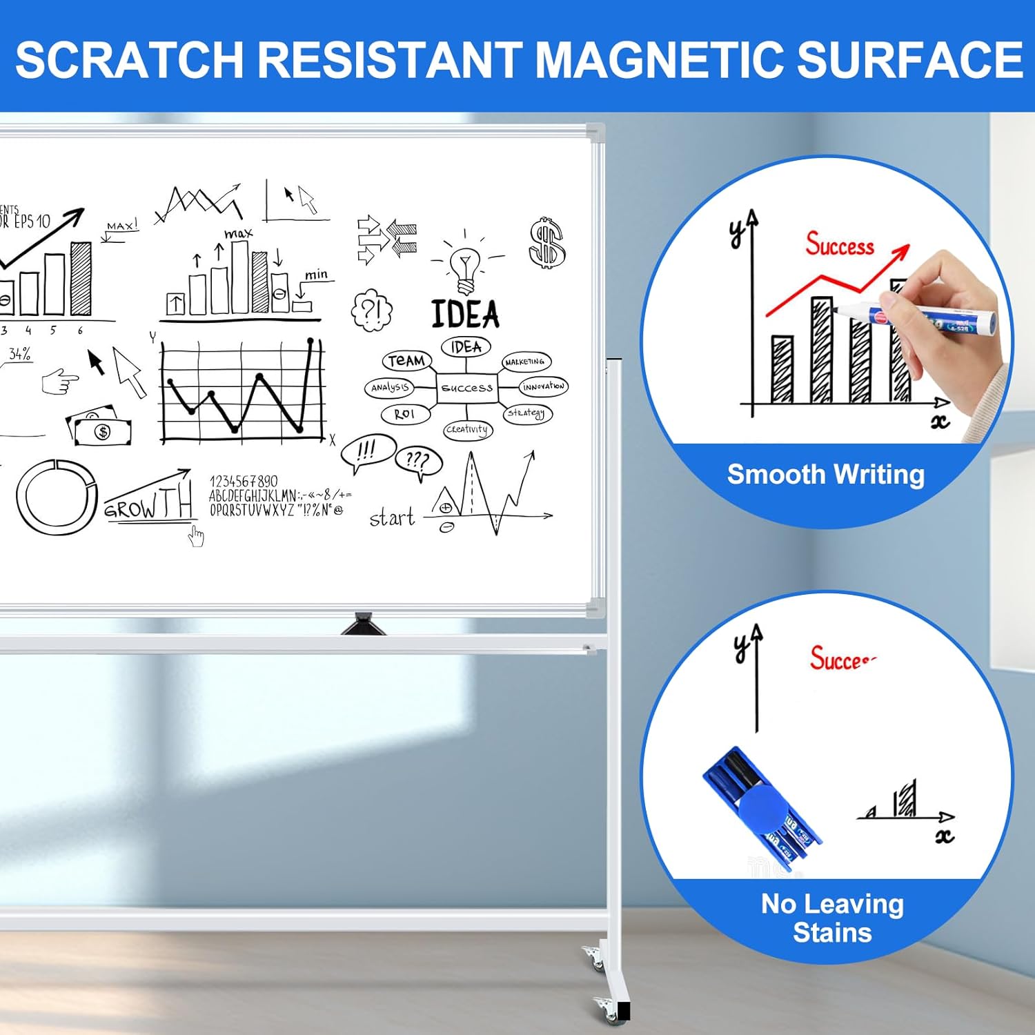 - EASY TO ERASE SURFACE & EASY FLIP DOUBLE SIDED DRY ERASE BOARD ---- Our large whiteboard 48" x 96" allows for both easy erase cleaning and protection from dents and scratches. Quick Flip Over Reversible Feature, Flip the board to the other side with the press of a button. You have TWICE the writing space when you utilize BOTH sides of the portable writing whiteboard with stand.