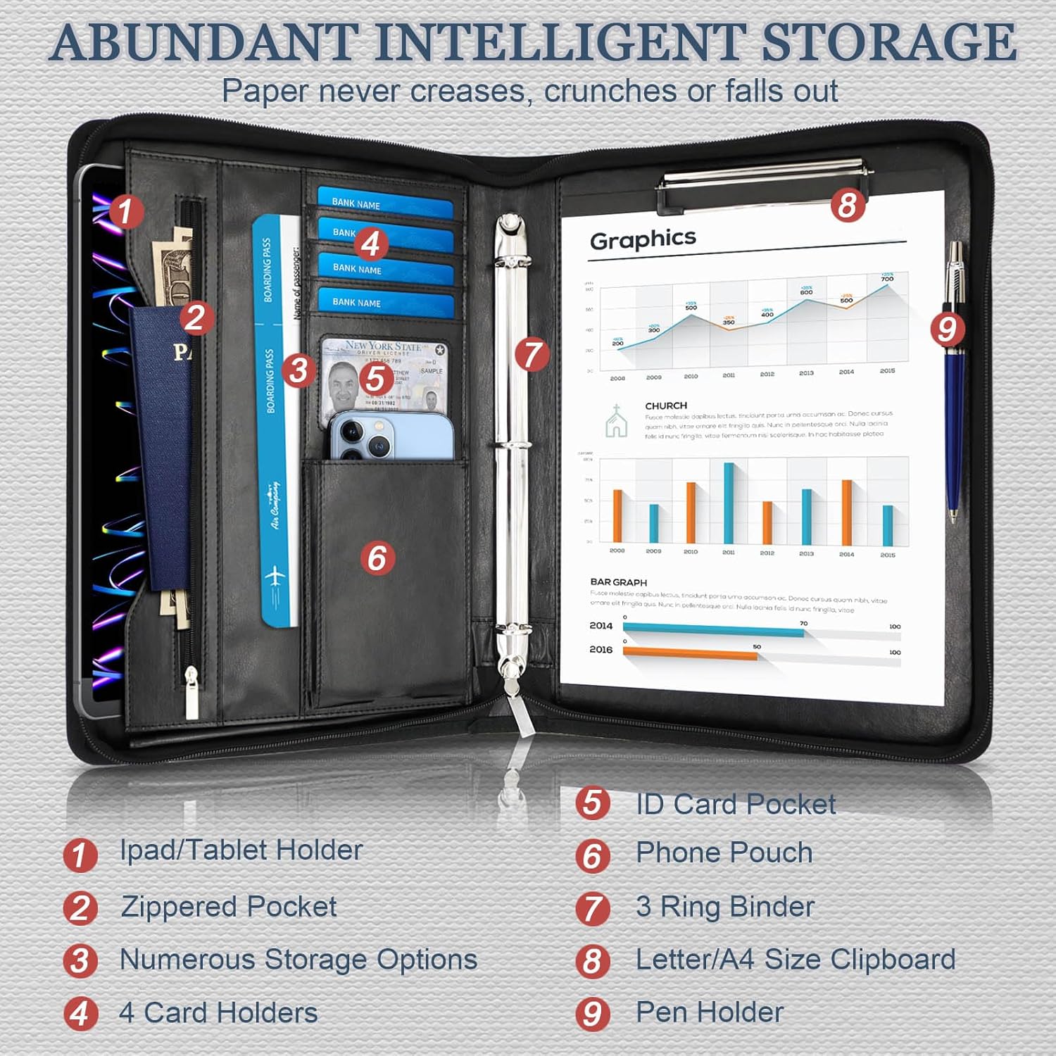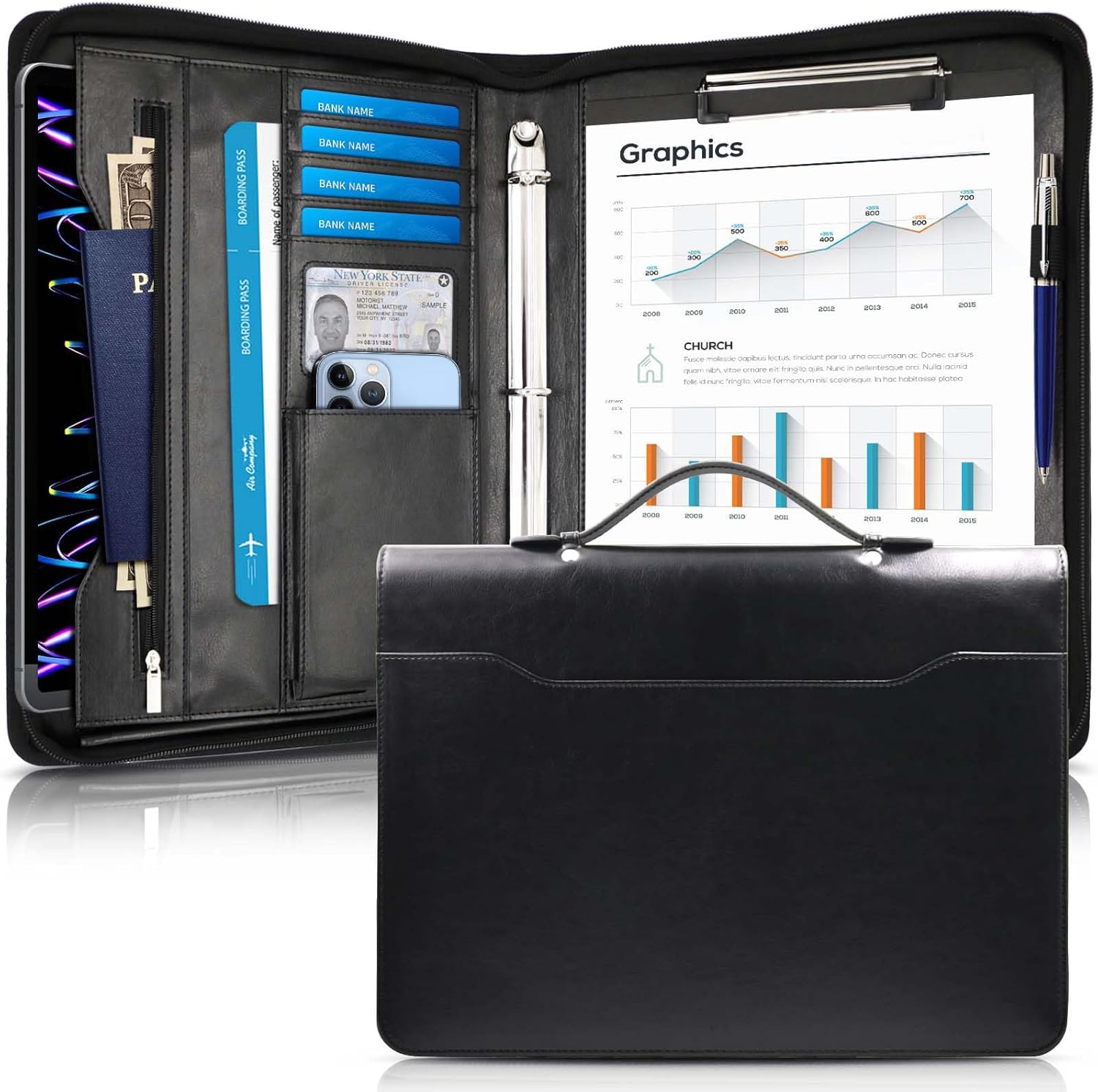 - 【Premium & Upgrade Material】Our padfolio binder is crafted from high-quality vegan leather, offering water resistance and exceptional durability. The reinforced stitching enhances longevity while maintaining an elegant appearance. The heavy-duty zipper glides smoothly and securely, ensuring your documents remain safe and wrinkle-free. It's an ideal document organizer for all your office supplies.