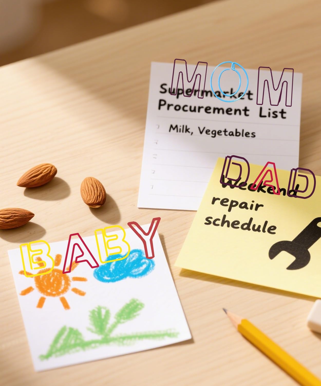 - FAMILY MEMORY SYSTEM——Family title clips (MOM/DAD/BABY) organize albums or bills. Creates household organization solutions with warm-tone designs.