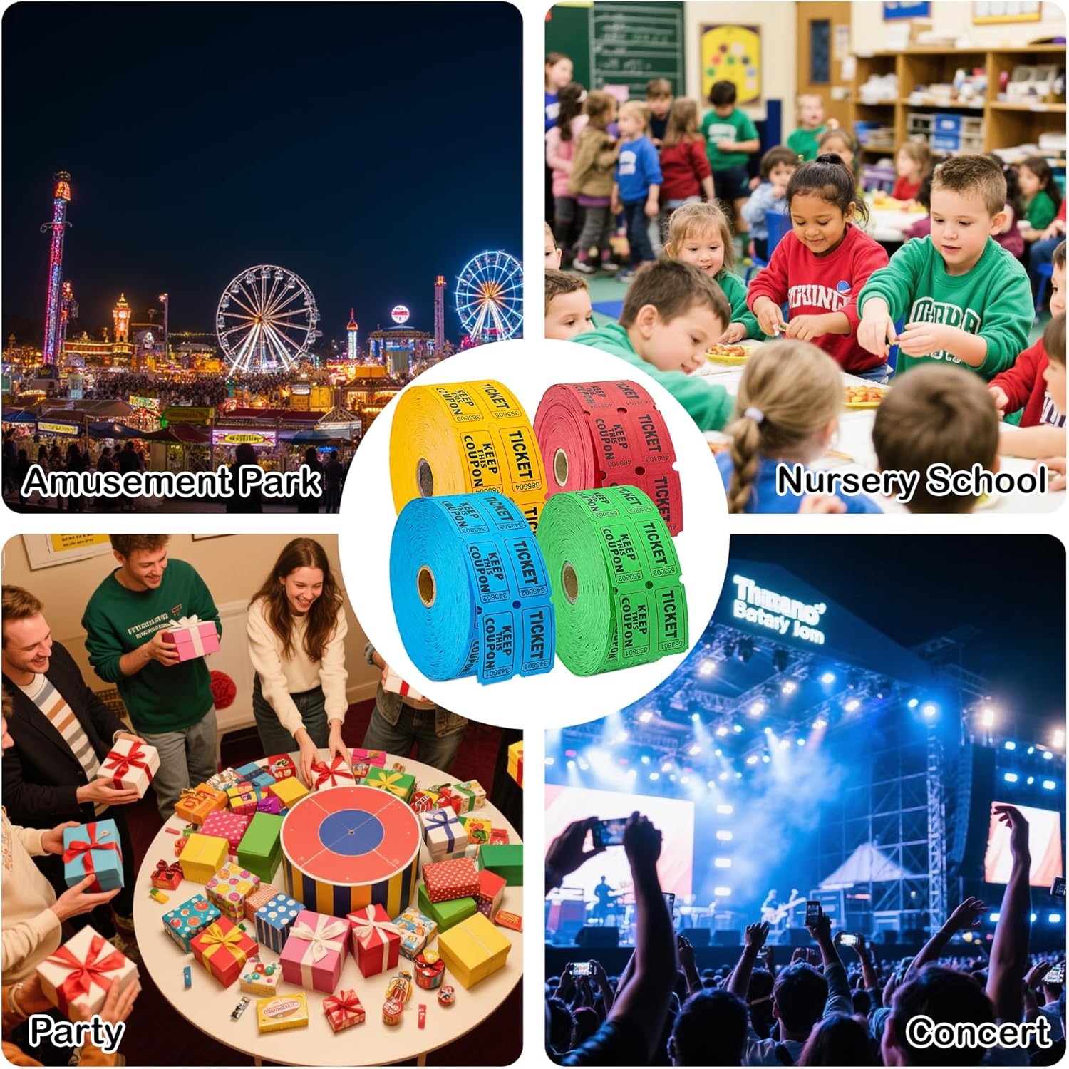 - Bright Colors -- The set contains four bright colors: red, green, blue, and yellow, each color contains 1200 raffle tickets