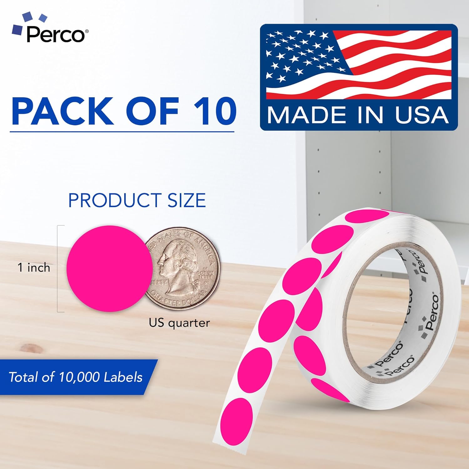 Perco Fluorescent Pink 1-Inch Perforated Circle Dot Sticker Labels — 10 Rolls, 10,000 Round Stickers — with Permanent Adhesive for Inventory Management, Color Coding, Garage Sales, Crafts—Made in USA