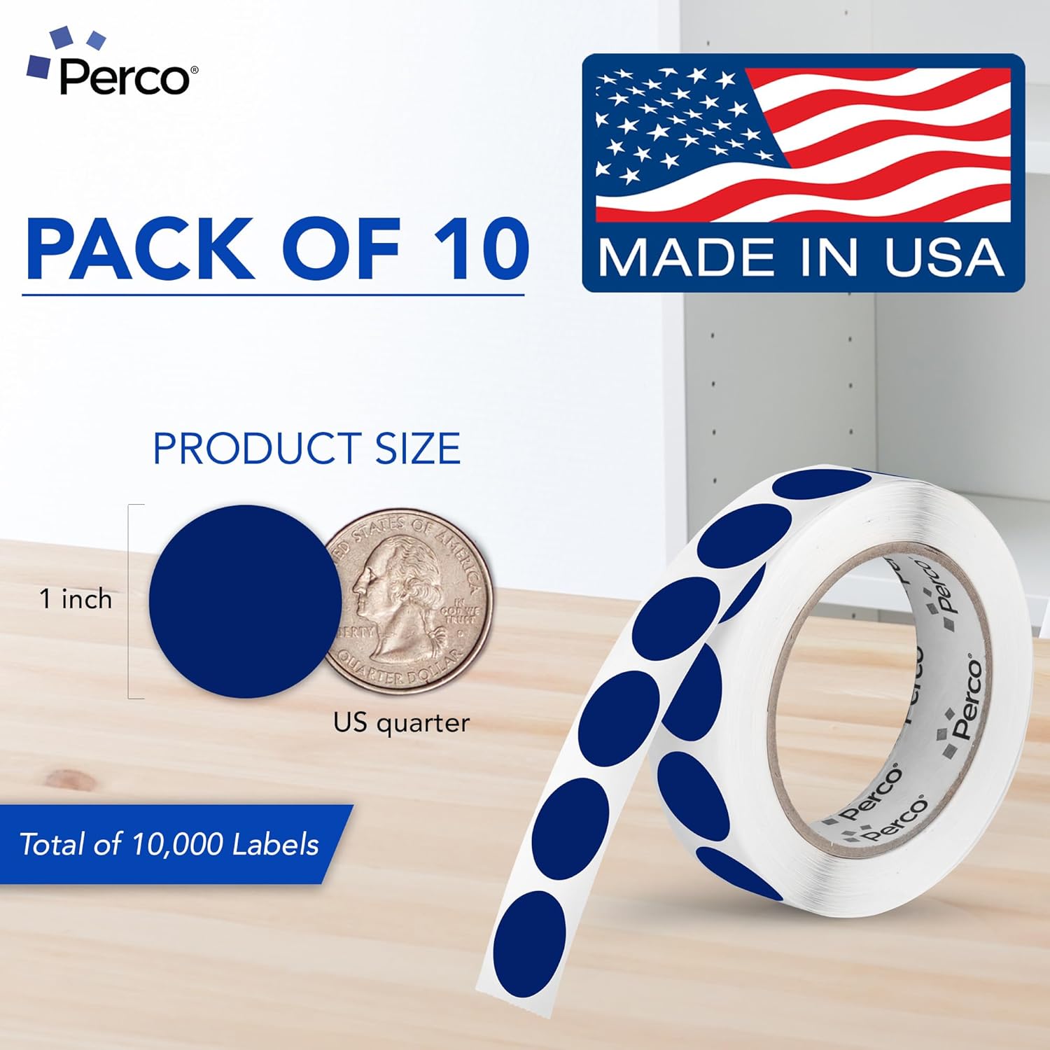 Perco Dark Blue 1-Inch Perforated Circle Dot Sticker Labels — 10 Rolls, 10,000 Round Stickers — with Permanent Adhesive for Inventory Management, Color Coding, Garage Sales, Crafts—Made in USA